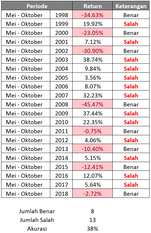 Dari analisis data historikal di atas, tingkat akurasi teori "Sell in May and Go Away" ternyata hanyalah sebesar 38%,  ditandai dengan negatifnya kinerja IHSG pada periode bulan Mei-Oktober selama delapan kali dari total 20 kali periode yang dihitung.