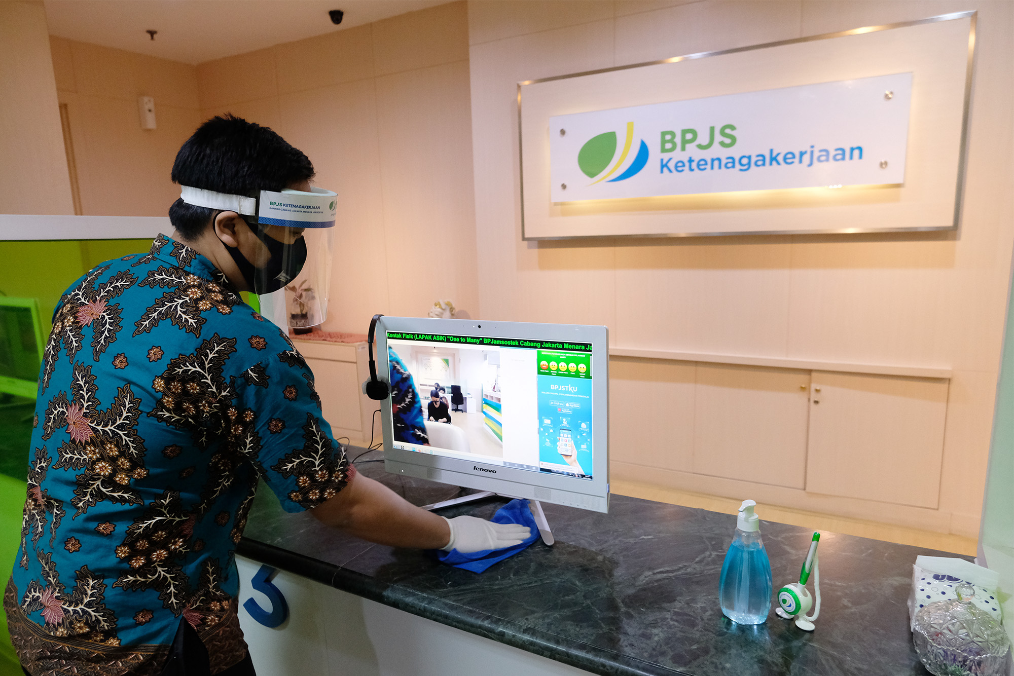 <p>Peserta BP Jamsostek mengantre untuk melakukan klaim melalui Layanan Tanpa Kontak Fisik (Lapak Asik) di kantor Cabang Jakarta Menara Jamsostek, Jakarta, Jum&#8217;at, 10 Juli 2020. Seiring dengan meningkatnya gelombang pemutusan hubungan kerja di tengah pandemi Covid-19, klaim BPJS Ketenagakerjaan turut melonjak. Pencairan tabungan di BP Jamsostek menjadi alternatif untuk mendukung daya beli pekerja yang tergerus. Sementara dalam rangka adaptasi kebiasaan baru dan untuk memutus penyebaran virus corona, BP Jamsostek telah menerapkan protokol pelayanan secara daring dan tanpa pertemuan secara fisik. Foto: Ismail Pohan/TrenAsia</p>