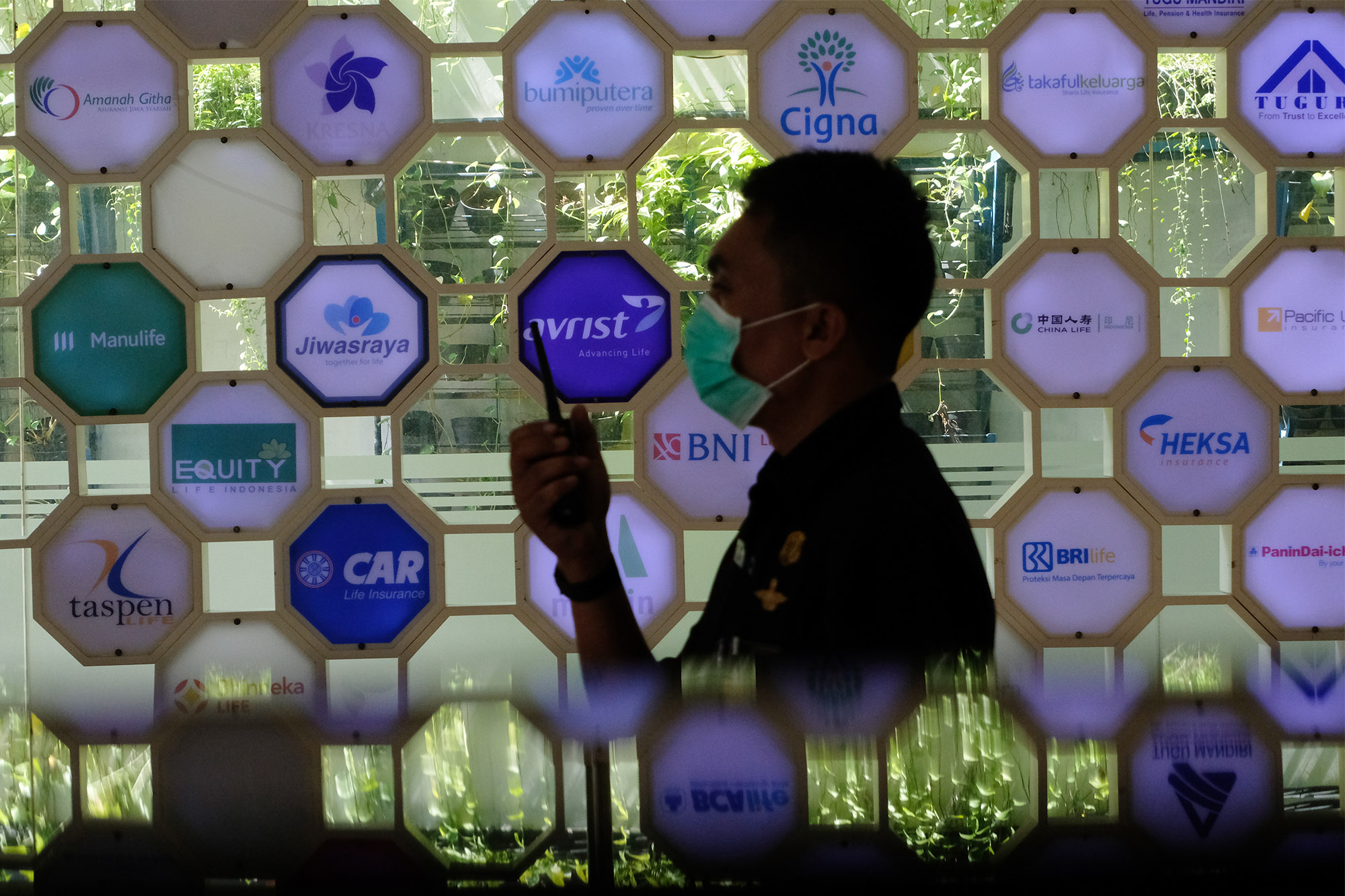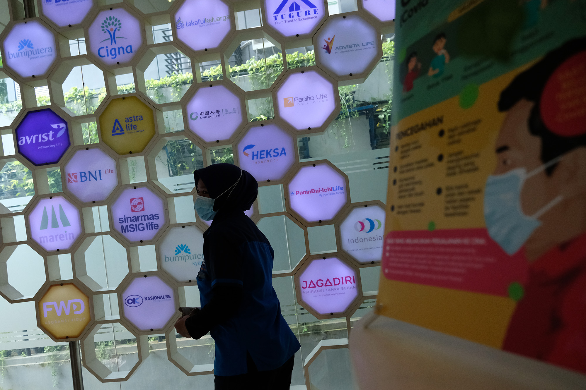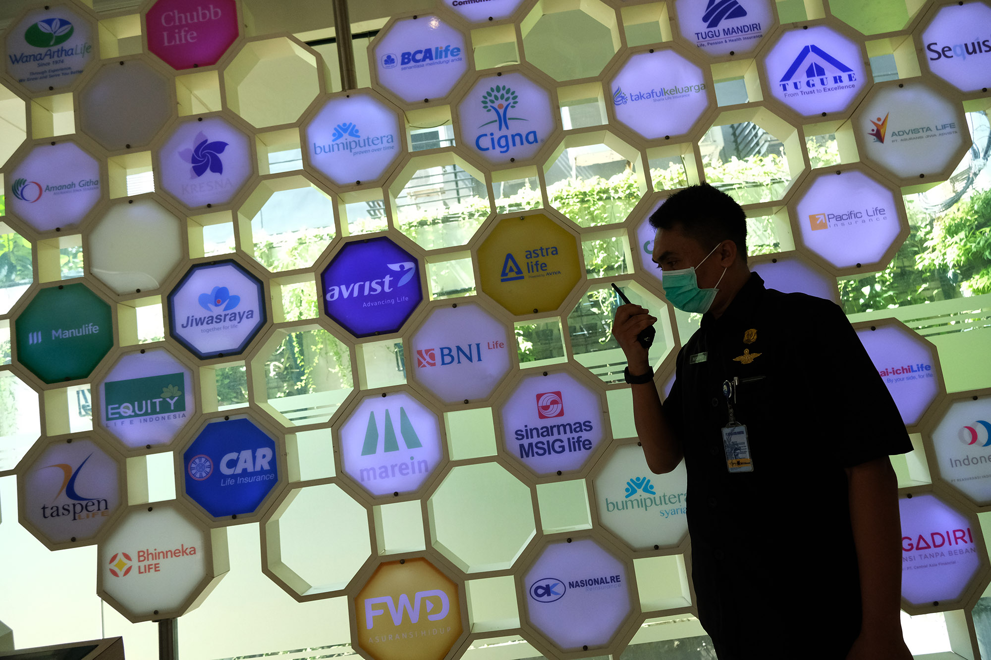 Pekerja membersihkan logo beberapa perusahaan asuransi di Kantor Asosiasi Asuransi Jiwa Indonesia (AAJI) di Jakarta, Rabu 10 Juni 2020. Berdasarkan data Otoritas Jasa Keuangan (OJK) pada Maret 2020 nilai aset asuransi jiwa mengalami penurunan secara tahun berjalan maupun secara tahunan sedangkan asuransi umum justru tumbuh, industri asuransi jiwa mencatatkan total aset Rp 529,2 trilun atau menurun 10,4 % (ytd) dari Desember 2019 senilai Rp 590,7 triliun. Foto: Ismail Pohan/TrenAsia