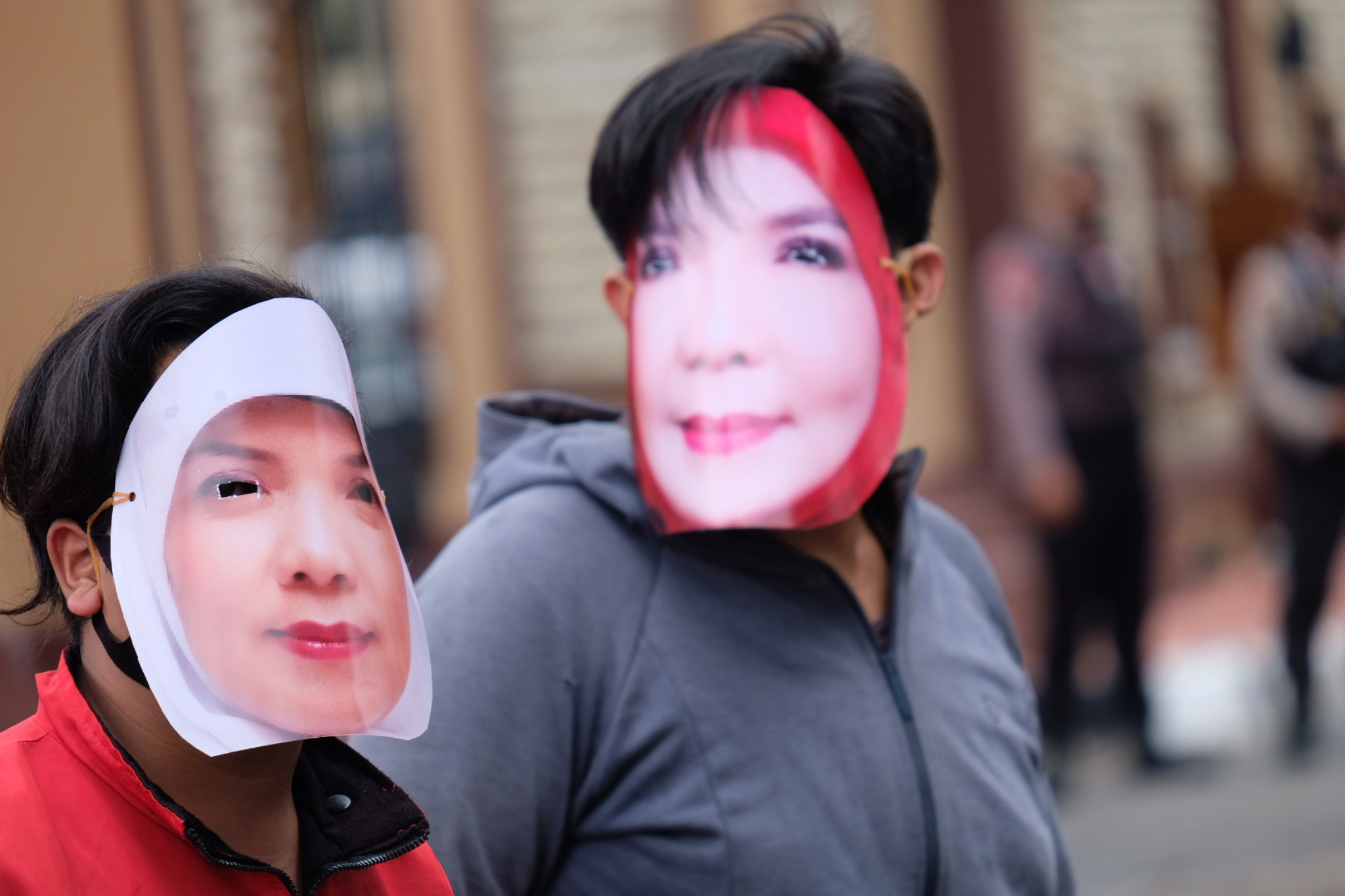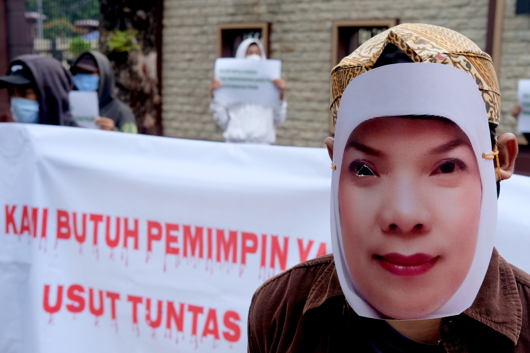 Massa yang tergabung dalam LSM Informasi Sosial (Infosos) Lampung dengan menggunakan topeng melakukan aksi di depan Gedung Mabes Polri, Jakarta, Jumat, 19 Februari 2021. Foto: Ismail Pohan/TrenAsia