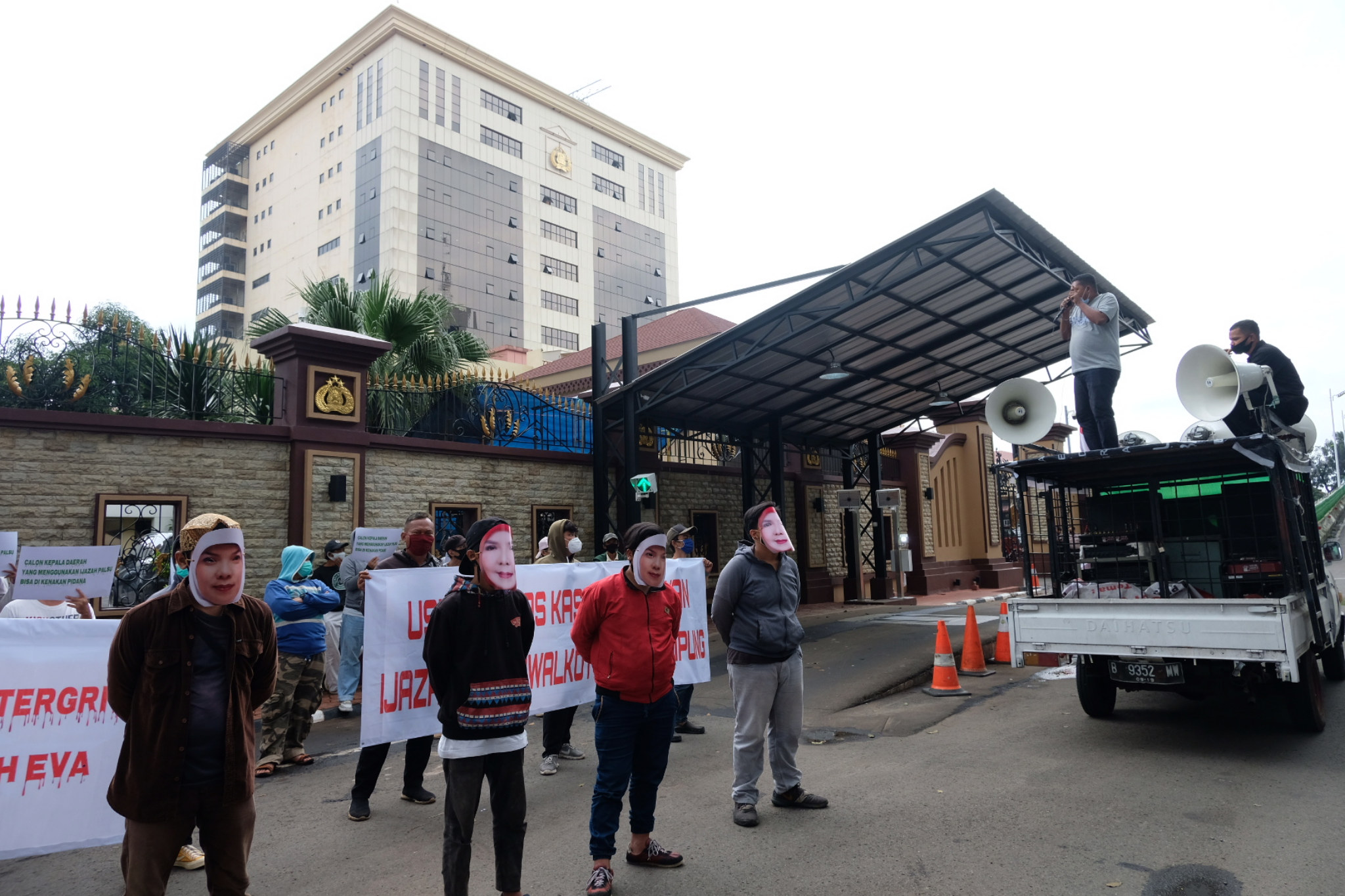 Massa dari LSM Informasi Sosial (Infosos) Lampung mendatangi Gedung Mabes Polri, Trunojoyo, Jakarta, Jum’at, 19 Februari 2021. Mereka datang untuk melakukan aksi unjuk rasa meminta agar Kepolisian Republik Indonesia dan Kemendagri segera menindaklanjuti laporan yang ditujukan kepada Walikota terpilih Bandar Lampung, Eva Dwiana atas dugaan penggunaan ijazah palsu.