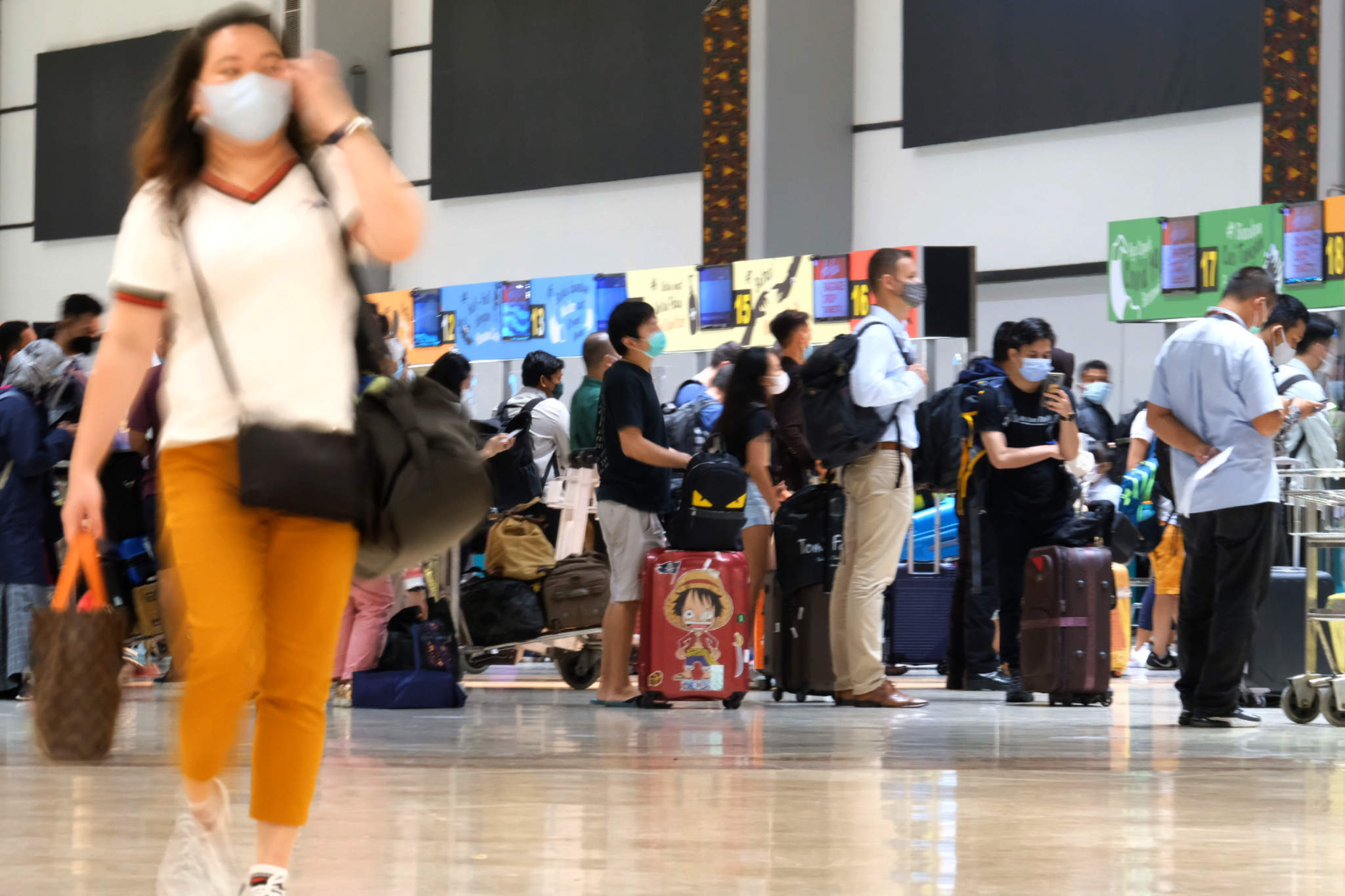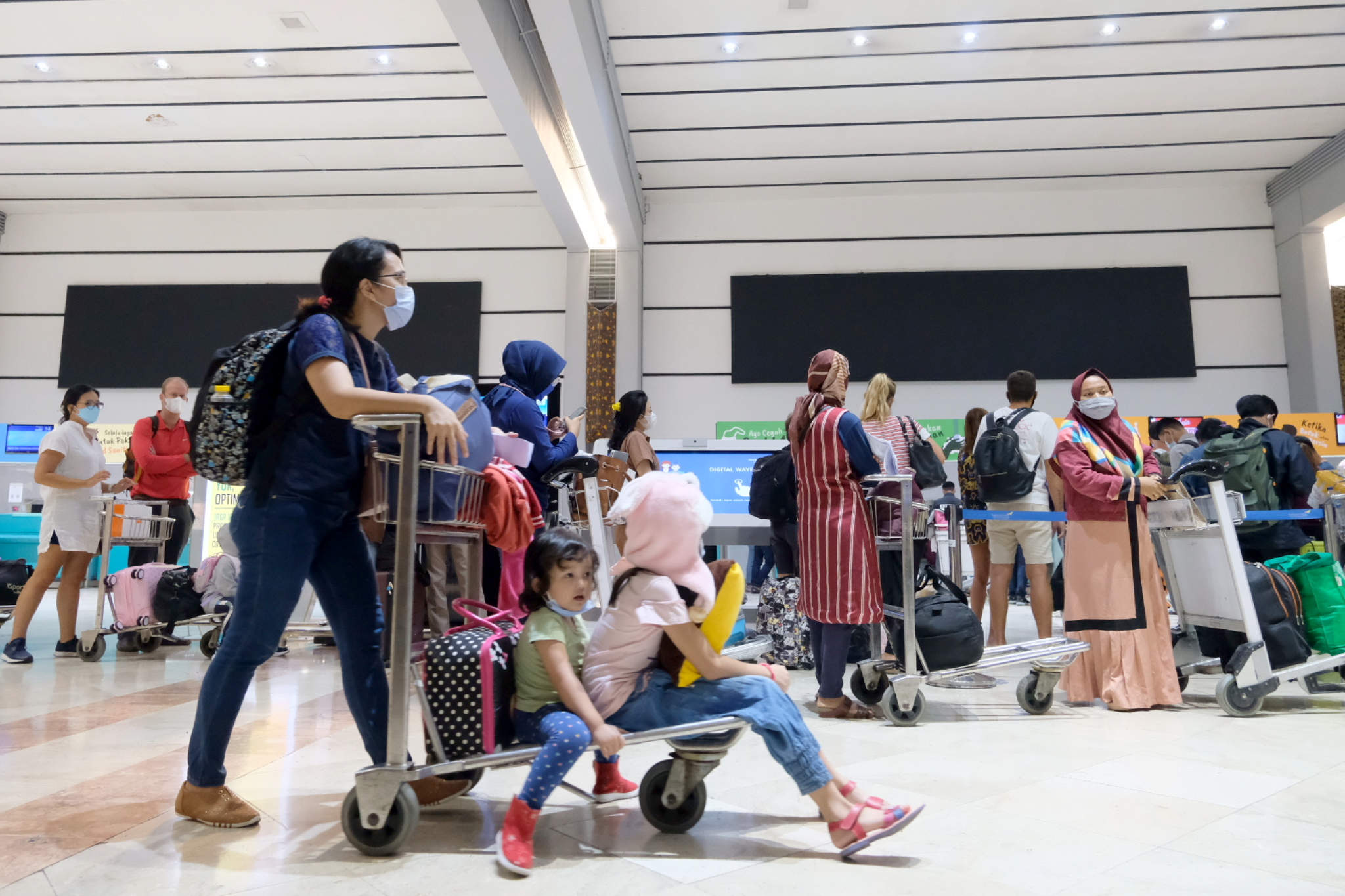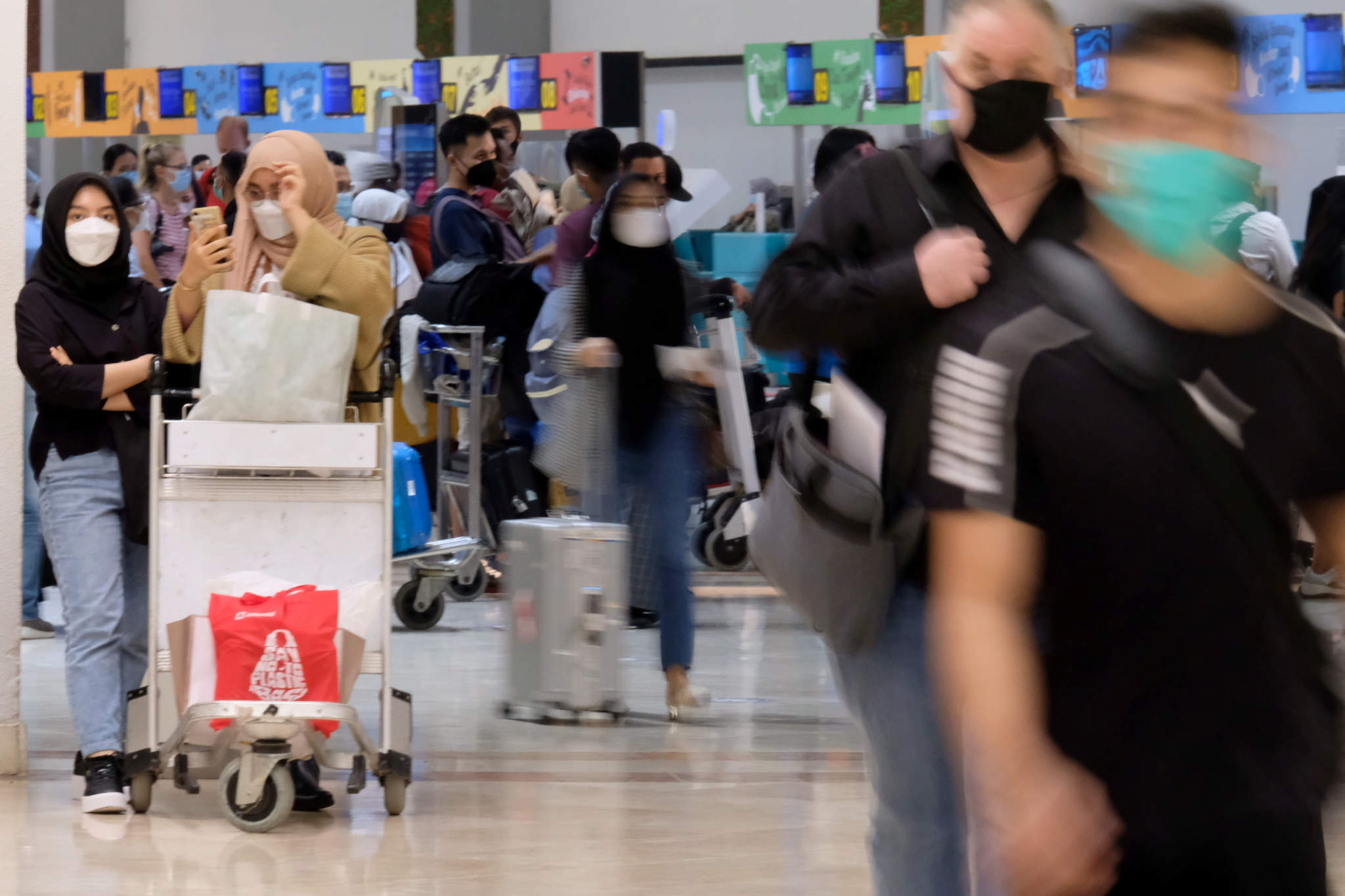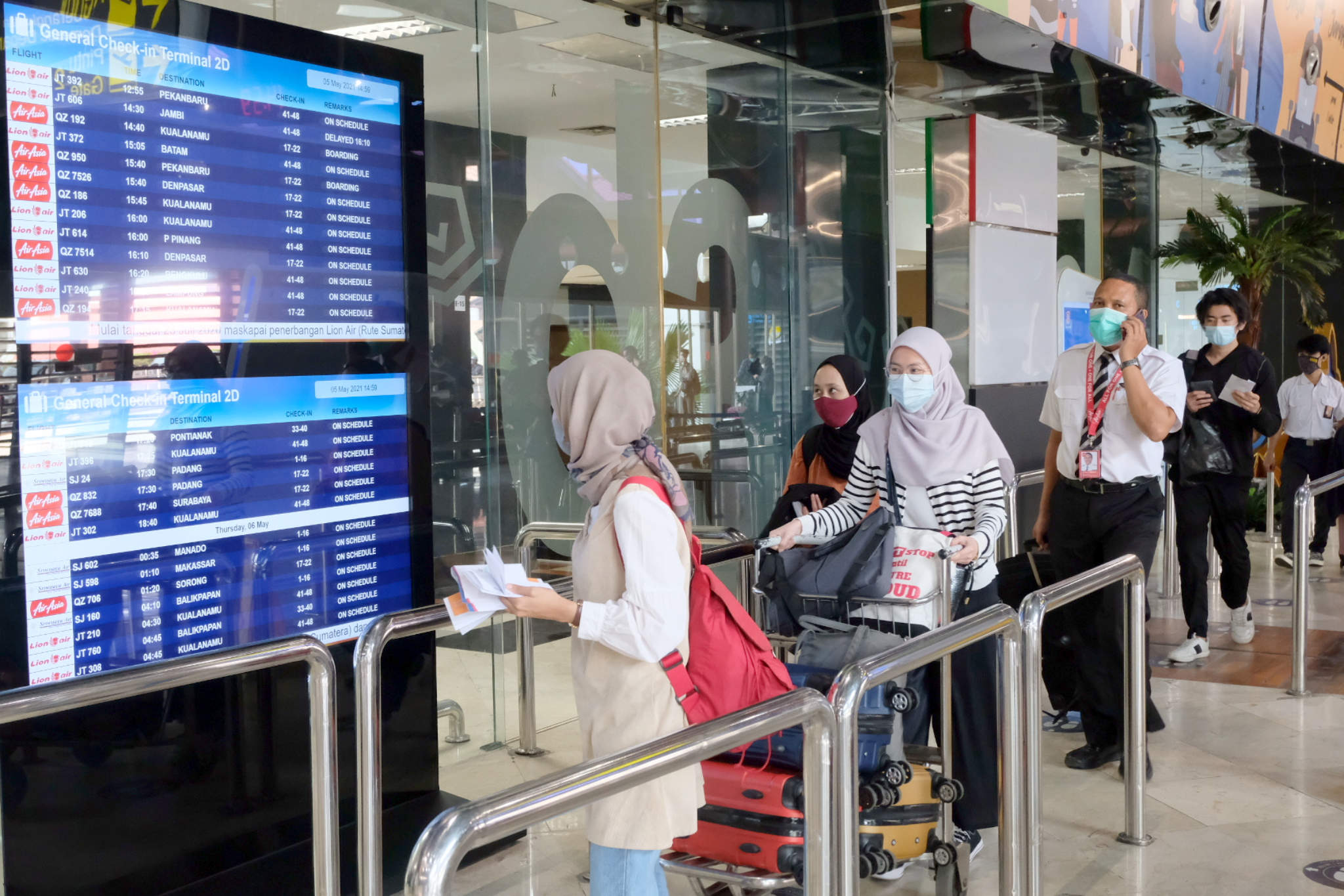 Calon penumpang melintas di area counter check in keberangkatan Terminal 2 Bandara Soekarno Hatta, Cengkareng, Tengerang, Banten, Rabu, 5 Mei 2021. Foto: Ismail Pohan/TrenAsia