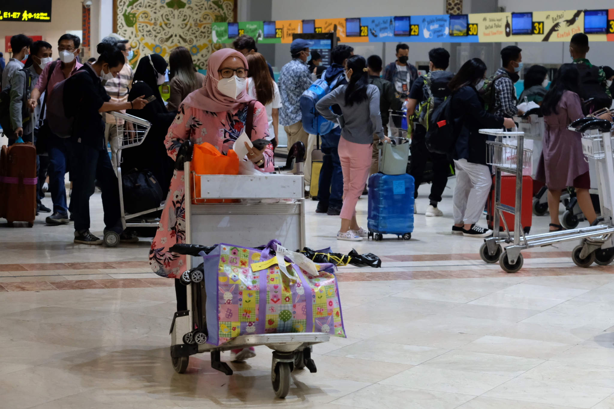 Satu hari menjelang larangan mudik Lebaran, ribuan penumpang memadati Bandara Sokarno Hatta (Soetta) Tangerang, Banten, Rabu, 5 Mei 2021.