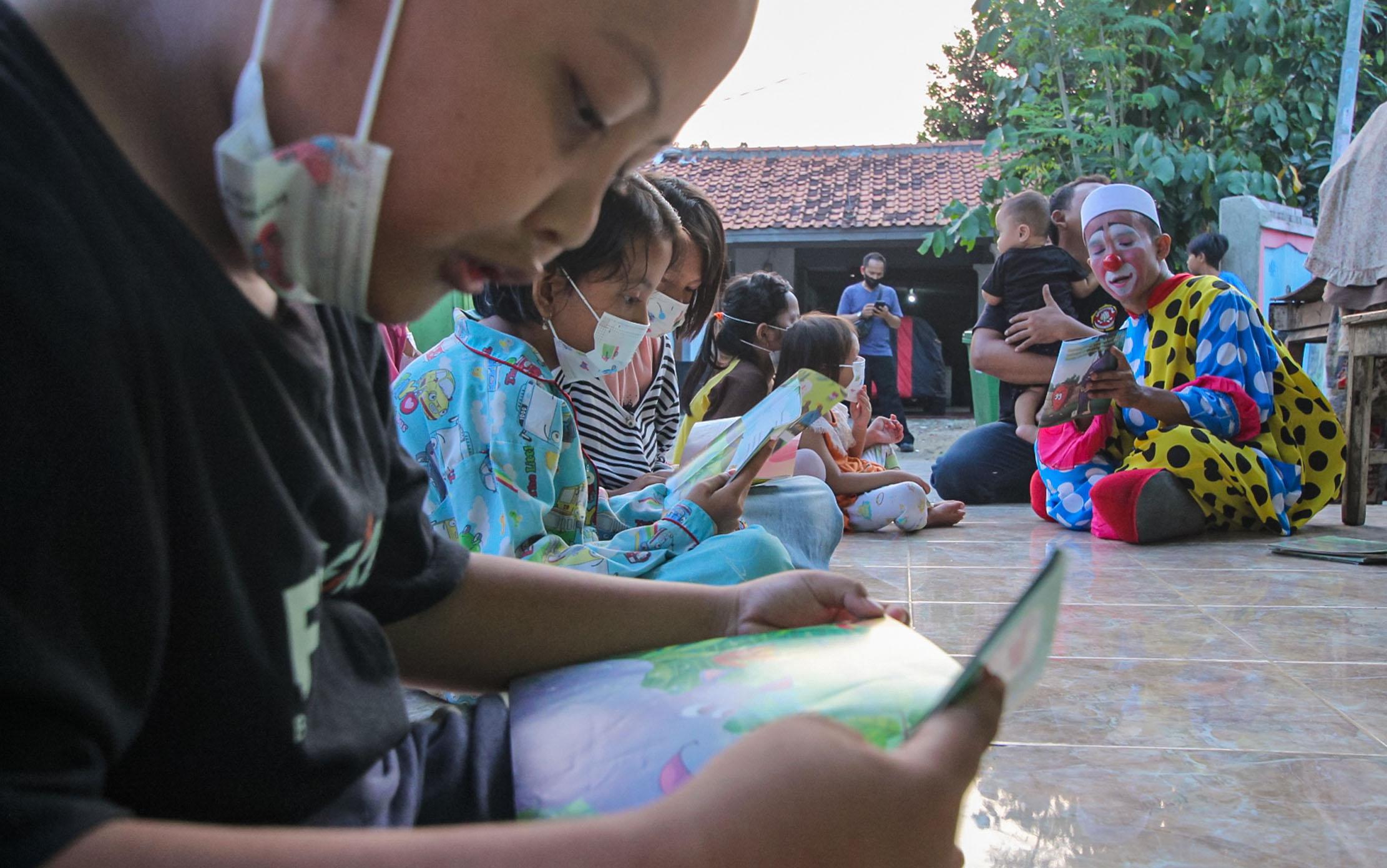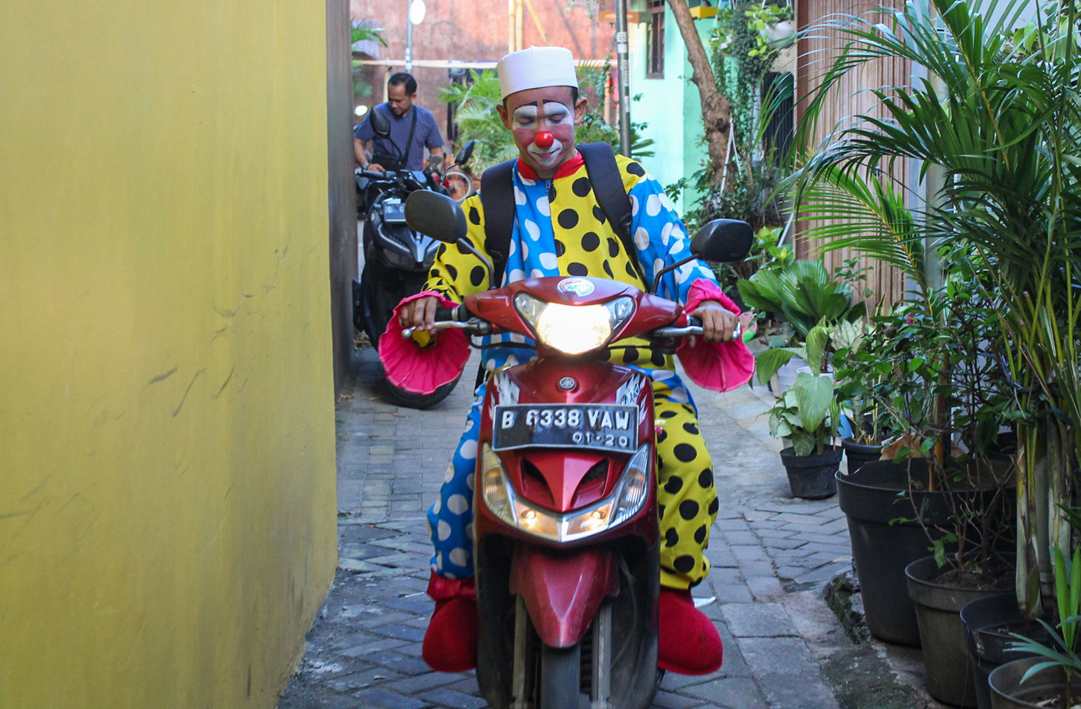 Sang badut syiar mengajar 45 anak yatim piatu dengan cara menyenangkan tanpa mengharap imbalan. Tujuannya adalah pengabdian dan pahala. Dia mengajari iqro, tajwid, tauhid, fiqih, dan ilmu agama yang dibutuhkan. Dengan dibalut hiburan, mengundang gelak tawa dan keceriaan. Itu sudah sangat bernilai bagi hidupnya. Foto : Panji Asmoro/TrenAsia