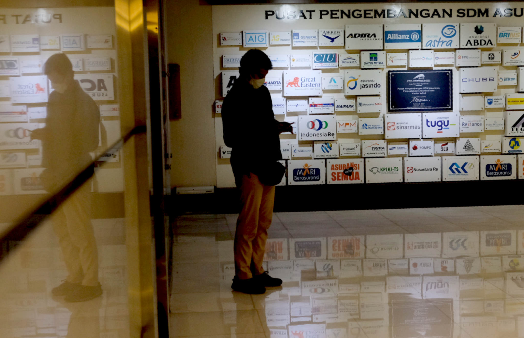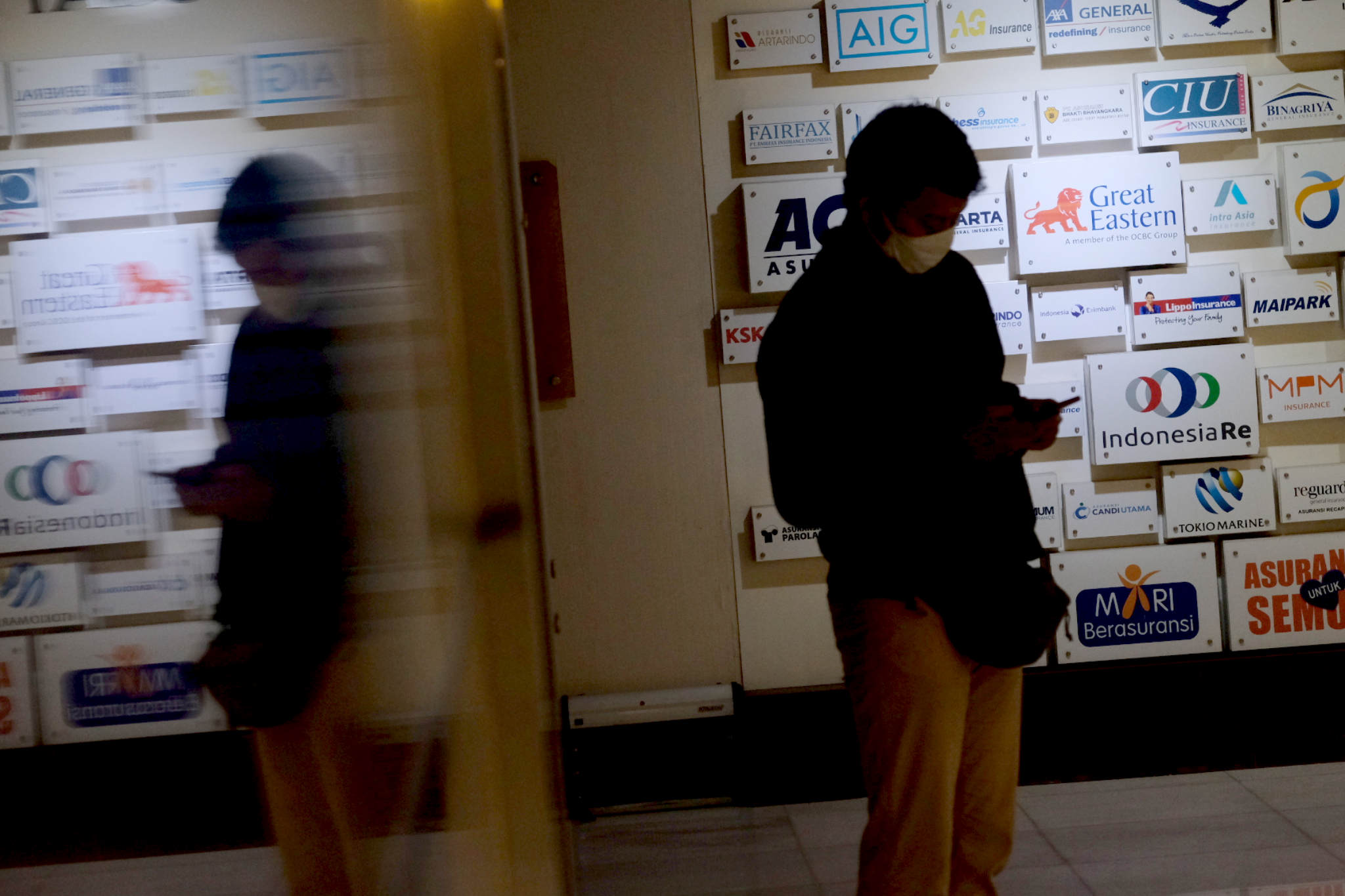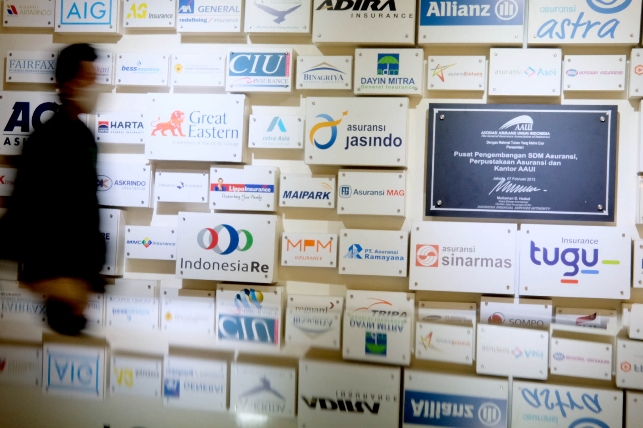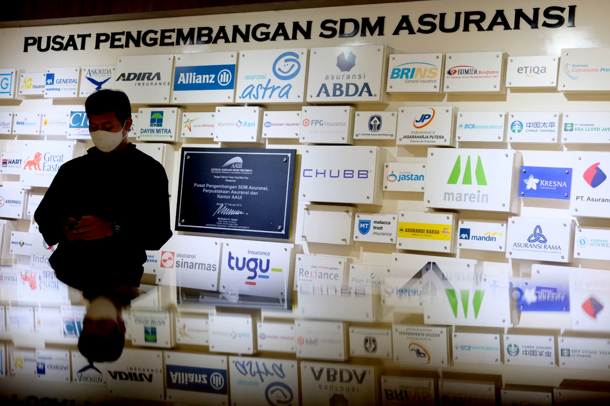 Karyawan beraktivitas di dekat logo sejumlah asuransi umum di Jakarta, Senin, 28 Juni 2021. Foto: Ismail Pohan/TrenAsia