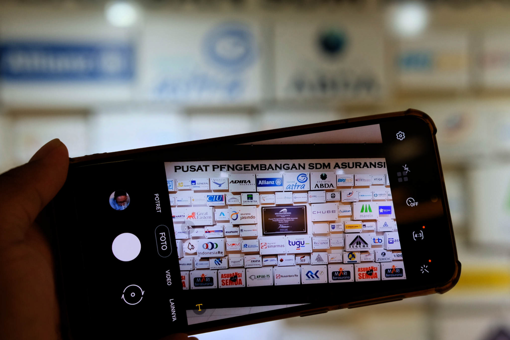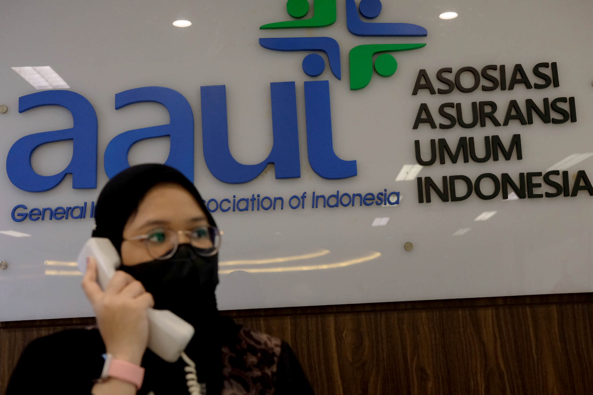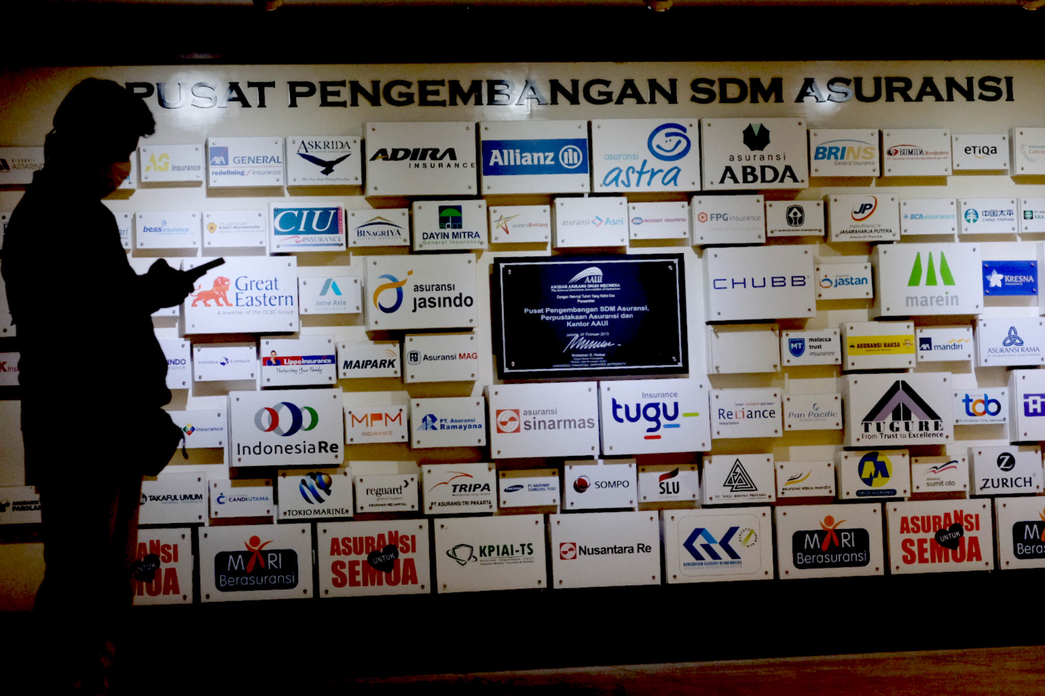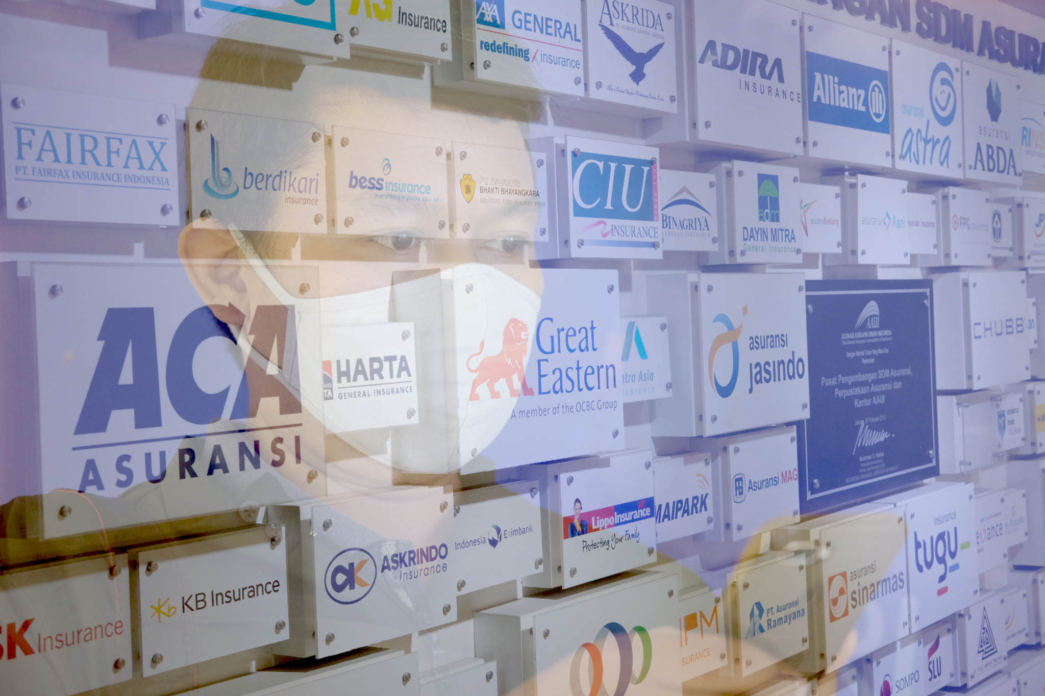 Karyawan beraktivitas di dekat logo sejumlah asuransi umum di Jakarta, Senin, 28 Juni 2021. Foto: Ismail Pohan/TrenAsia
