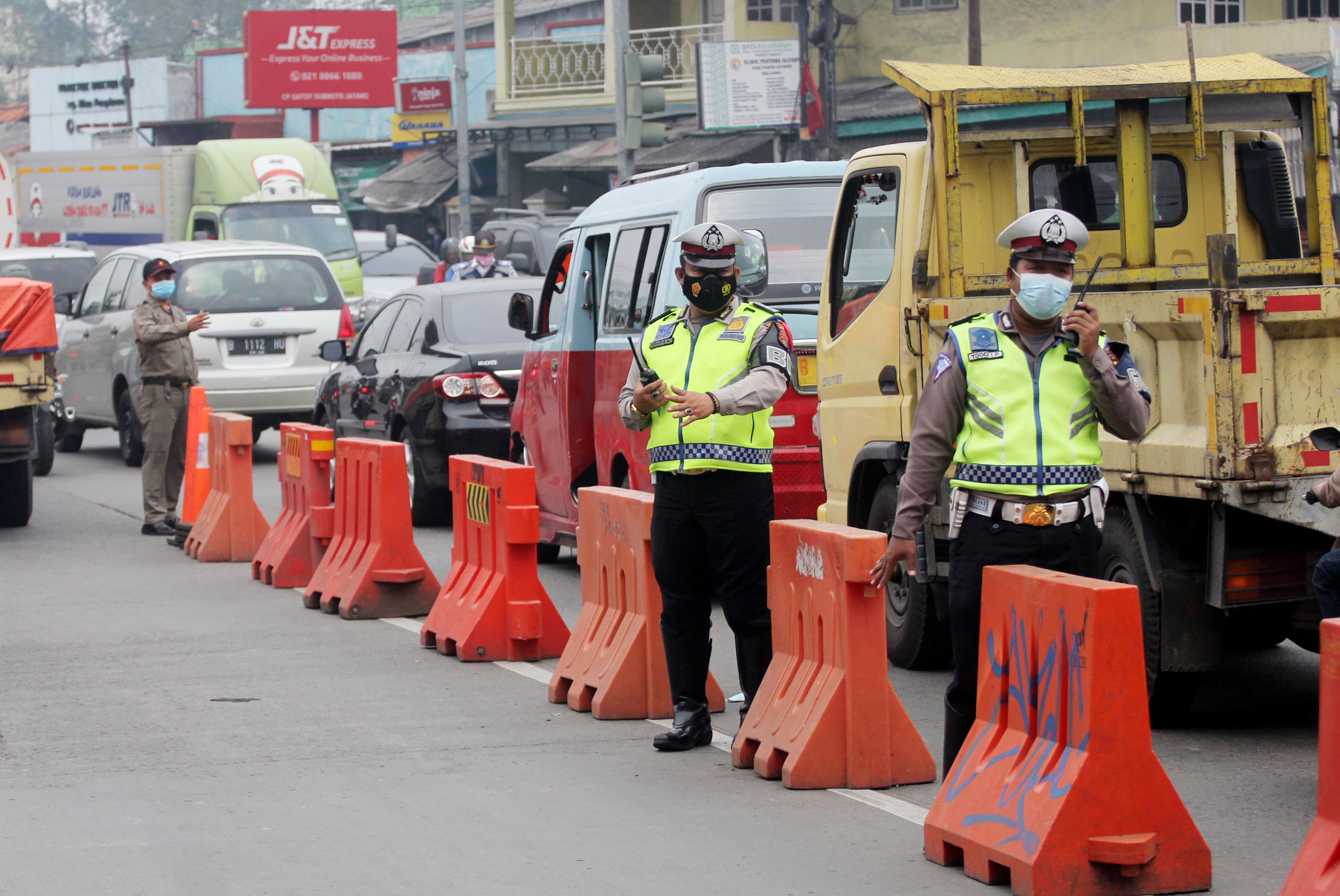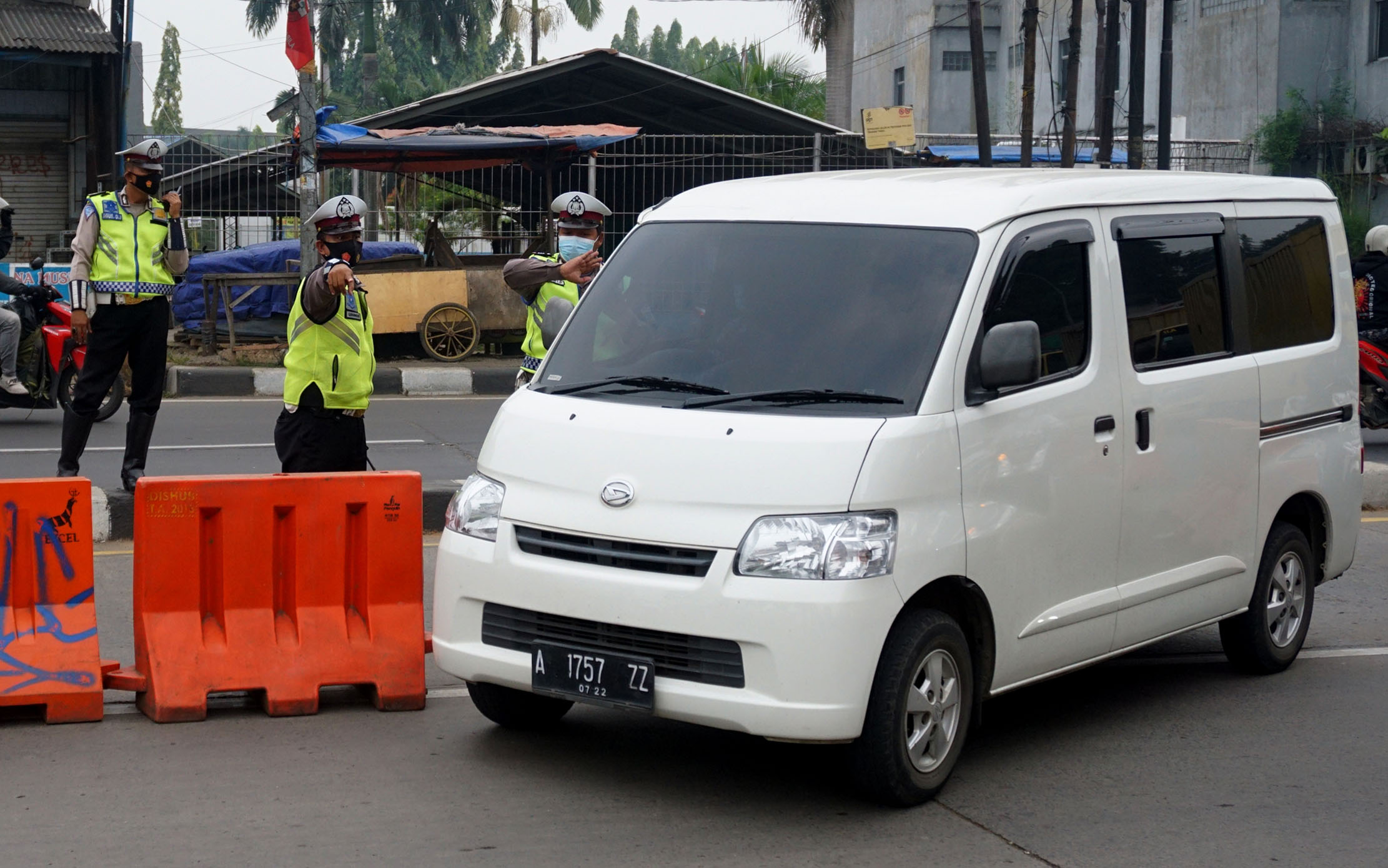 Sejumlah petugas gabung dari Kepolisian,TNI dan aparat terkait tengah melakukan penyekatan di kawasan Jatake dan gerbang tol Cikupa Kabupaten Tangerang dalam rangka penerapan larangan mudik , Jumat 8 Mei 2021. Foto : Panji Asmoro/TrenAsia