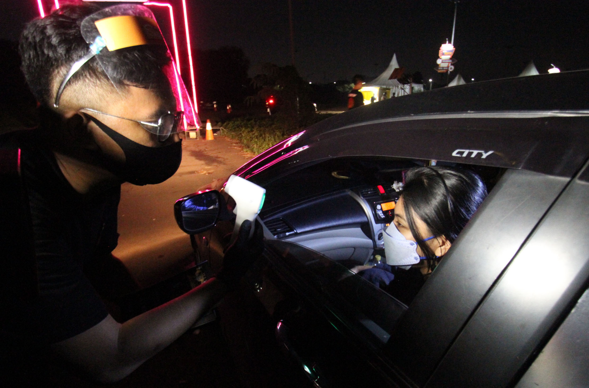 Acara dilakukan dengan mematuhi semua protokol kesehatan, mulai dari pemeriksaan suhu tubuh penonton, penyemprotan disinfektan mobil pengunjung serta seluruh crew yang menggunakan standar medis untuk menjamin kenyamanan dan keamanan para penonton. Nonton bareng siaran pertandingan sepak bola secara drive-in ini sebagai hiburan alternatif bagi masyarakat ditengah pandemi COVID-19. Foto: Panji Asmoro/TrenAsia