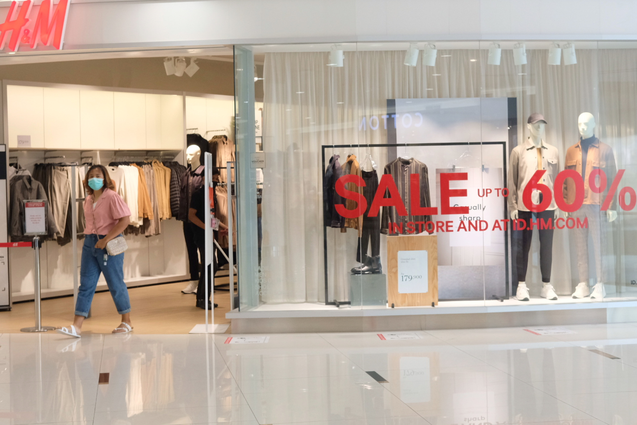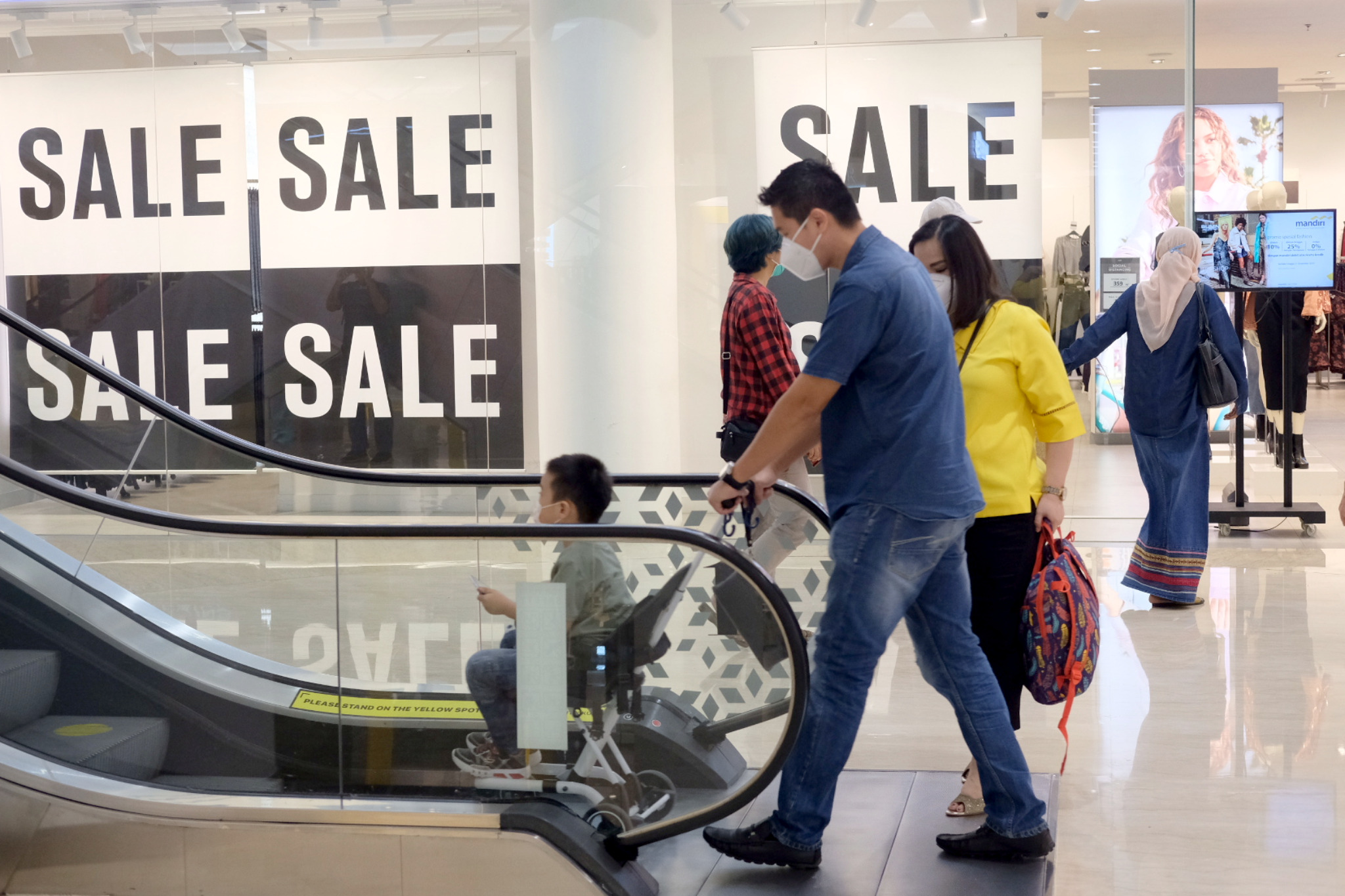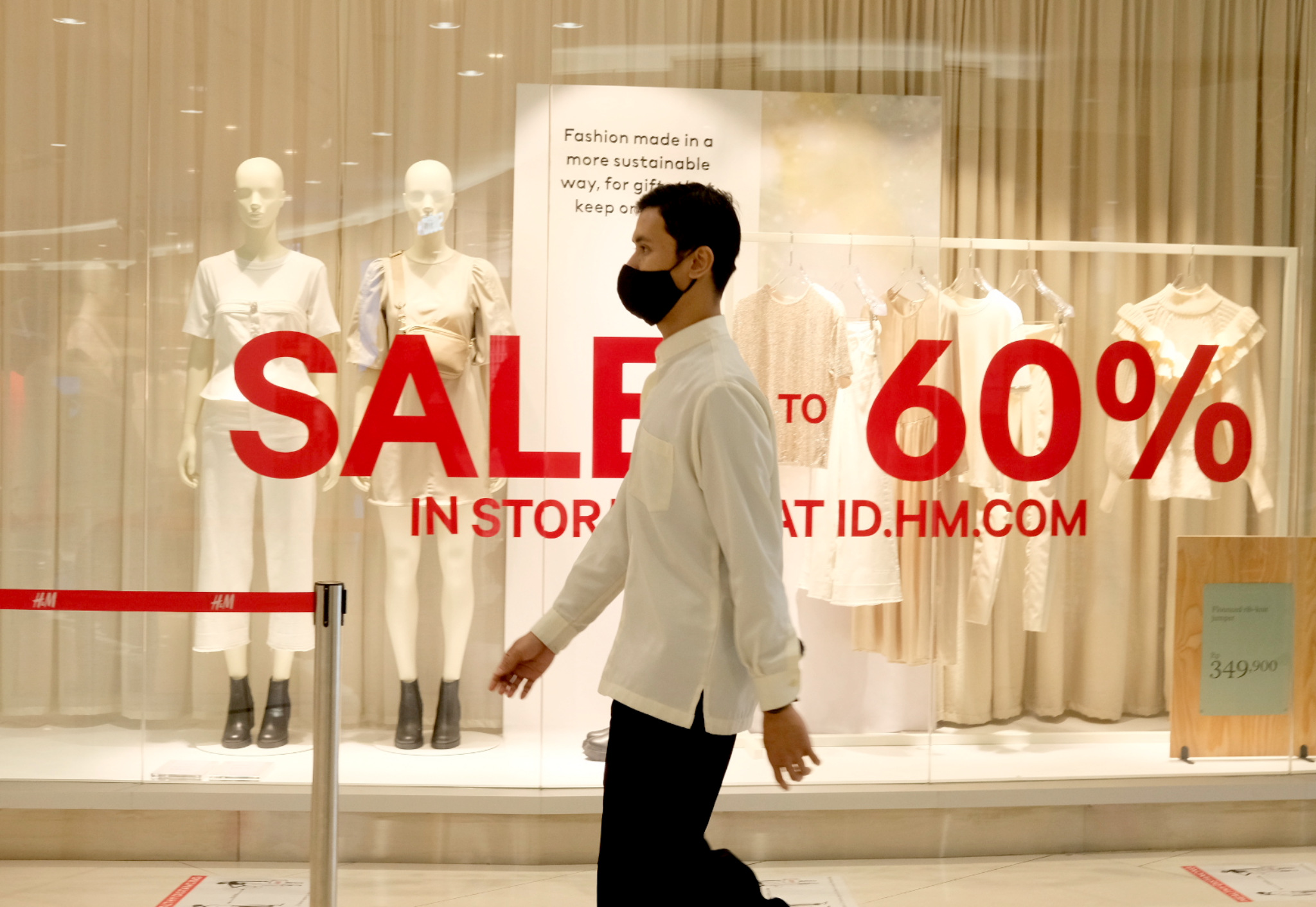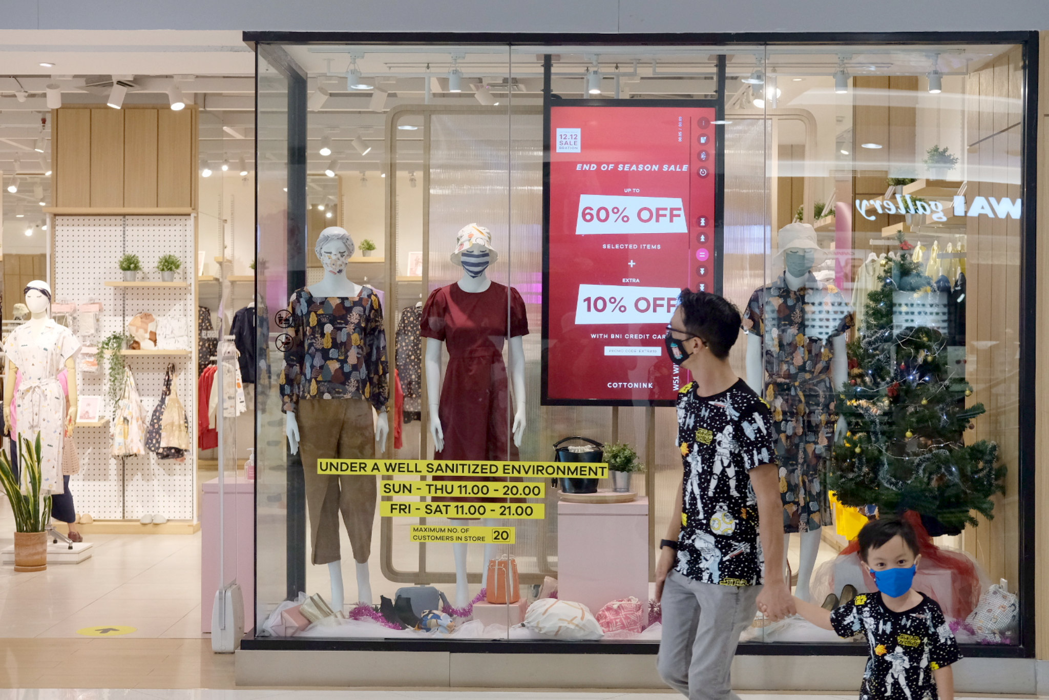 Pengunjung melintas di depan salah satu tenant pusat perbelanjaan yang menggelar diskon belanja Natal dan Tahun Baru di Mal Senayan City, Jakarta, Jum’at, 25 Desember 2020. Foto: Ismail Pohan/TrenAsia