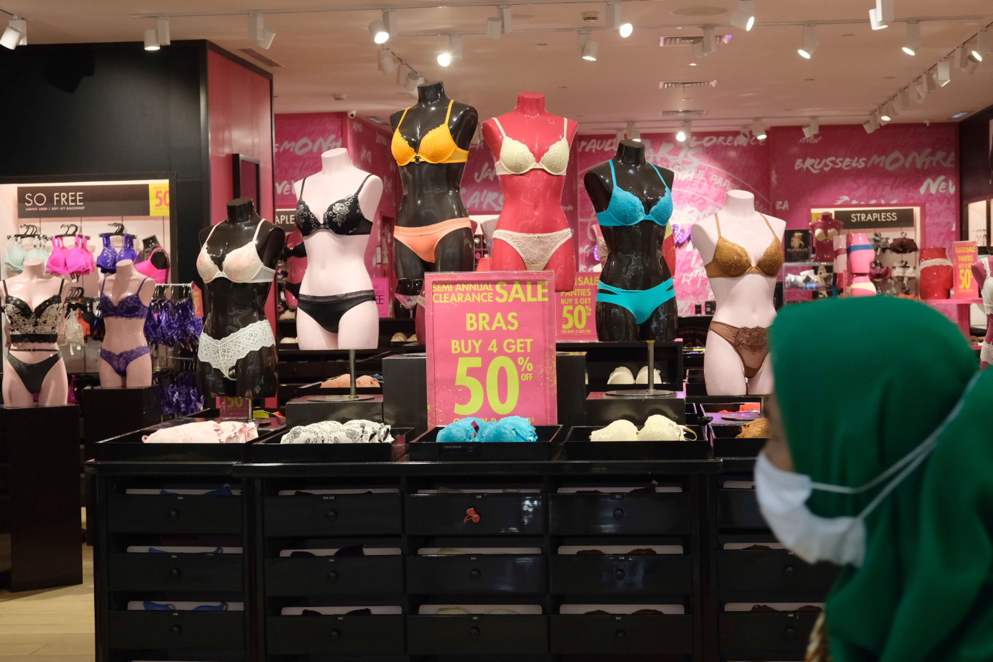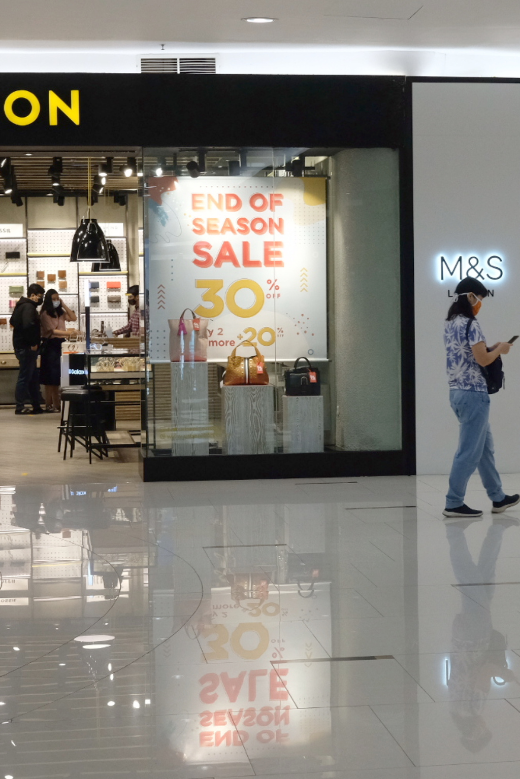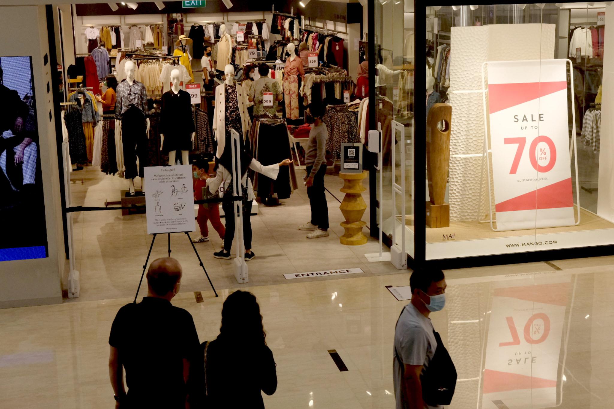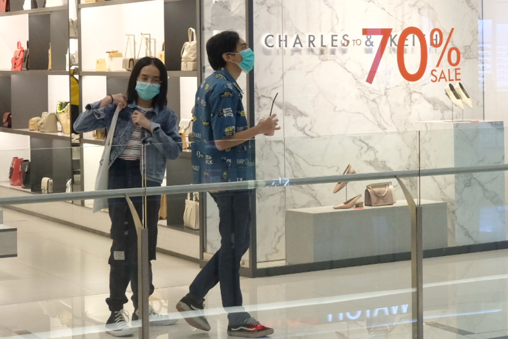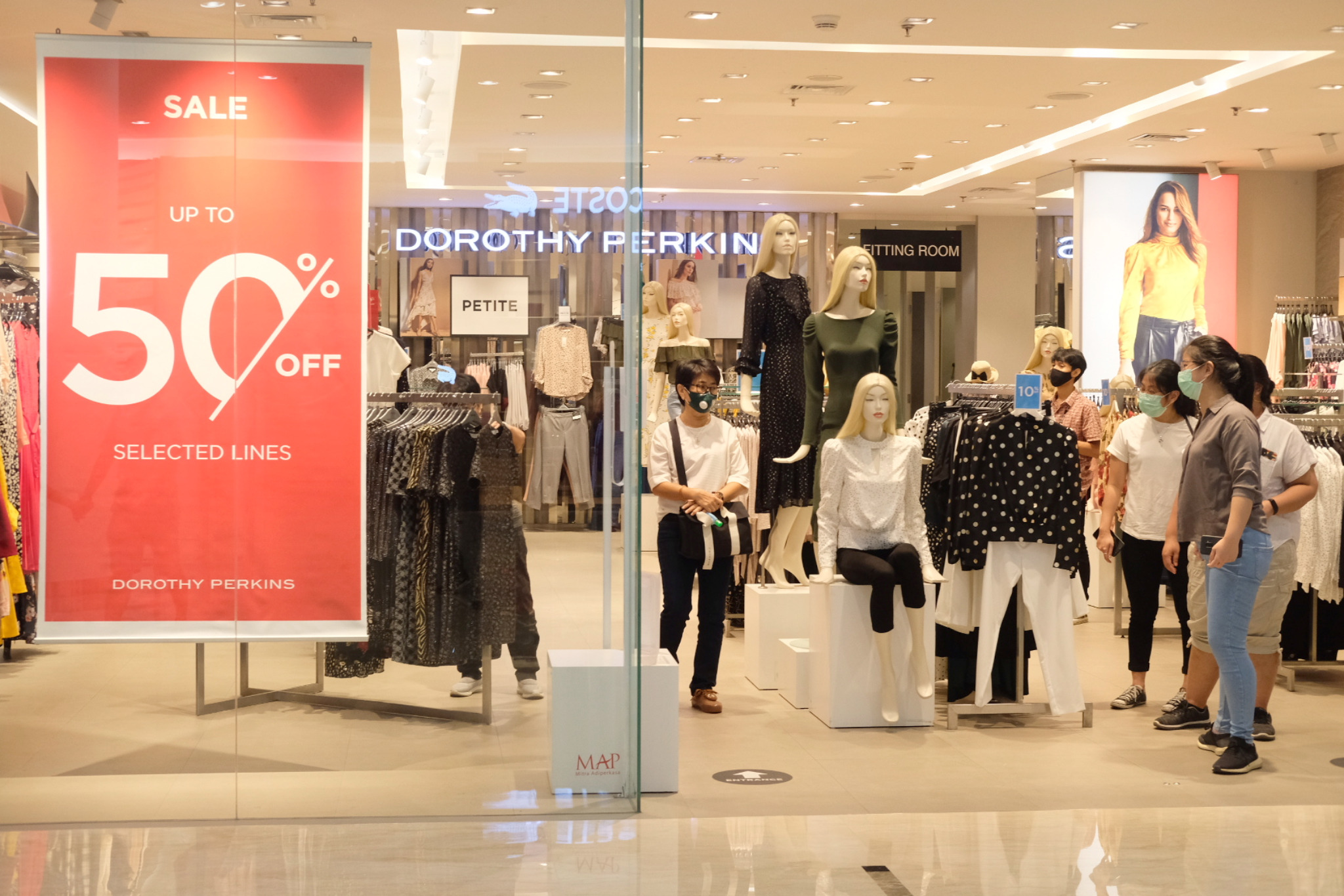 Pengunjung melintas di depan salah satu tenant pusat perbelanjaan yang menggelar diskon belanja Natal dan Tahun Baru di Mal Senayan City, Jakarta, Jum’at, 25 Desember 2020. Foto: Ismail Pohan/TrenAsia