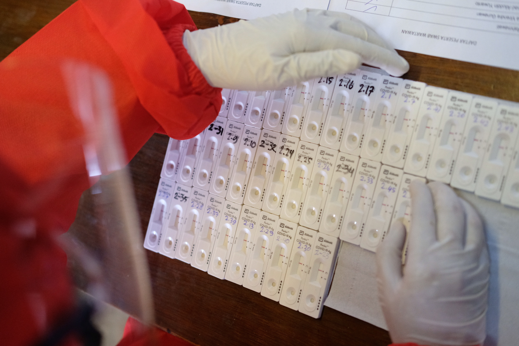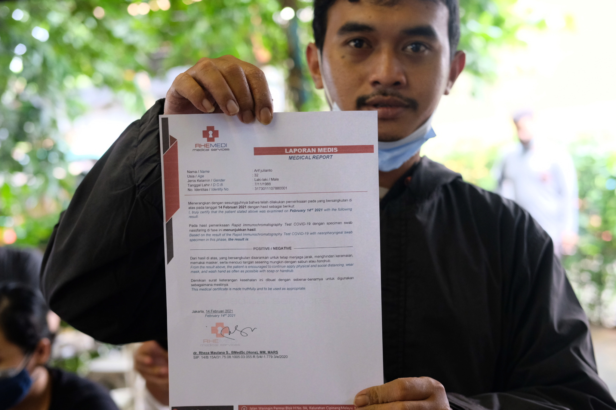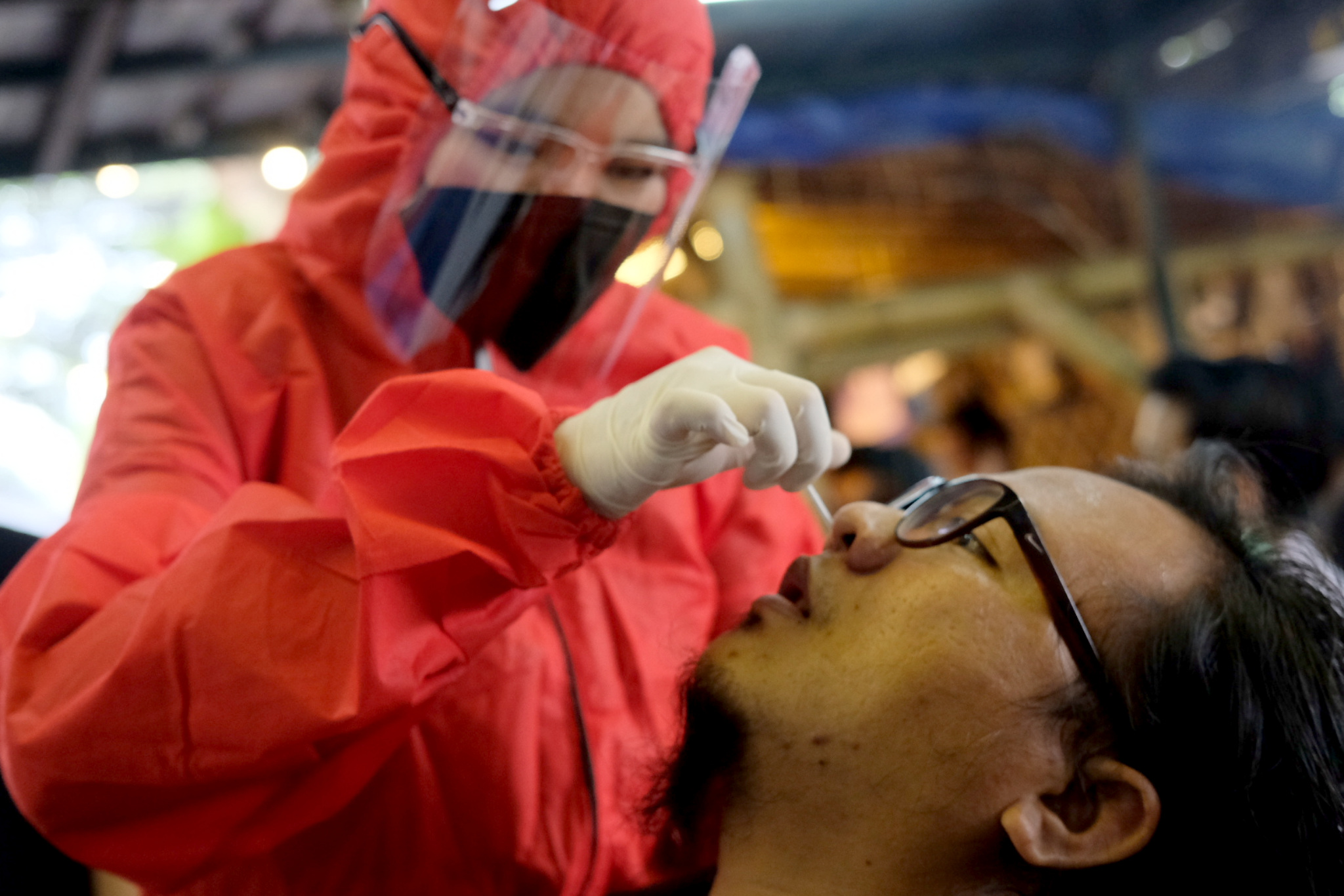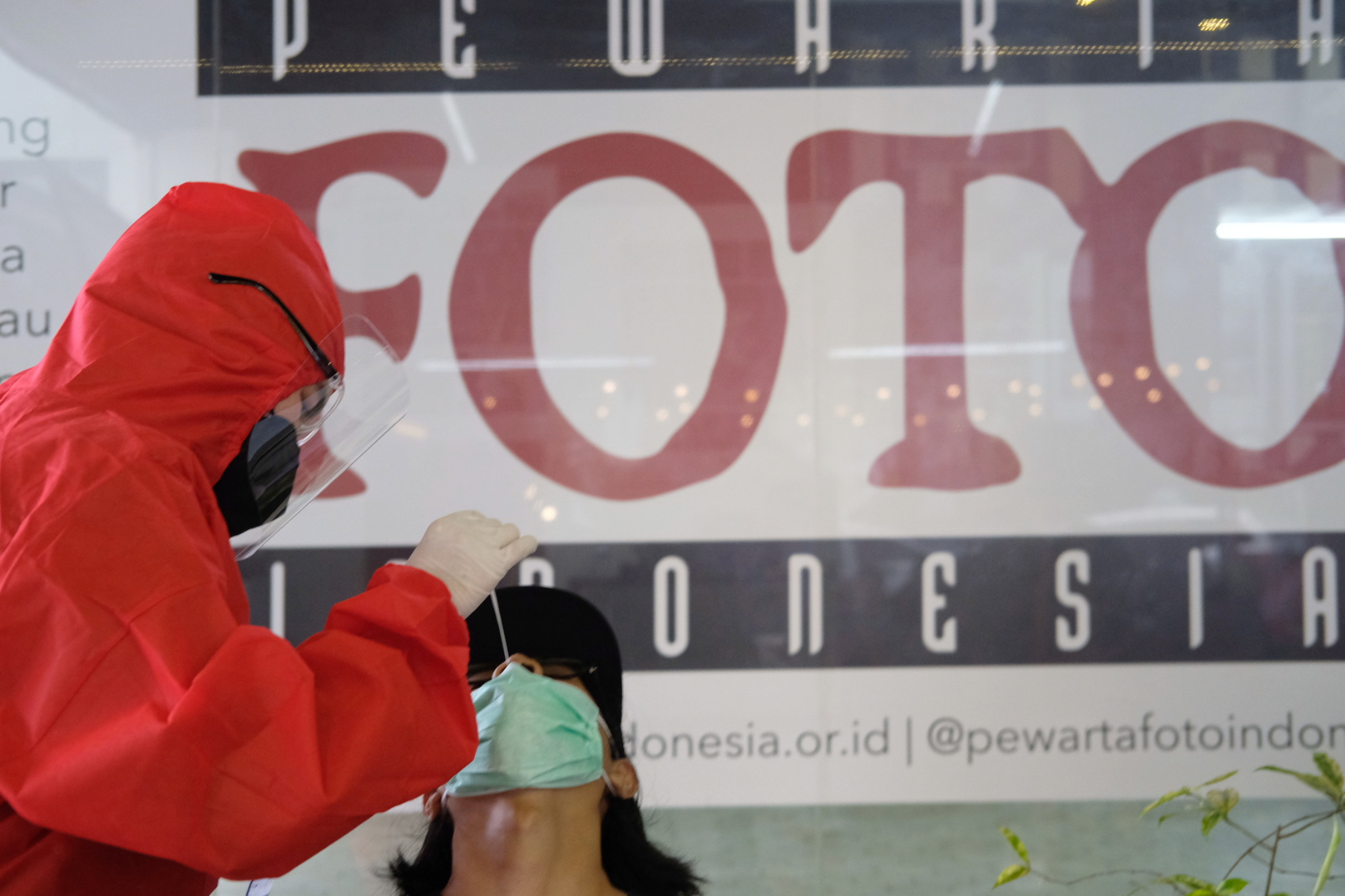 Tenaga kesehatan melakukan tes usap antigen COVID-19 terhadap pewarta foto di Sekretariat Pewarta Foto Indonesia (PFI) Pusat, di kawasan Ampera, Jakarta, Minggu, 14 Februari 2021. Foto: Ismail Pohan/TrenAsia