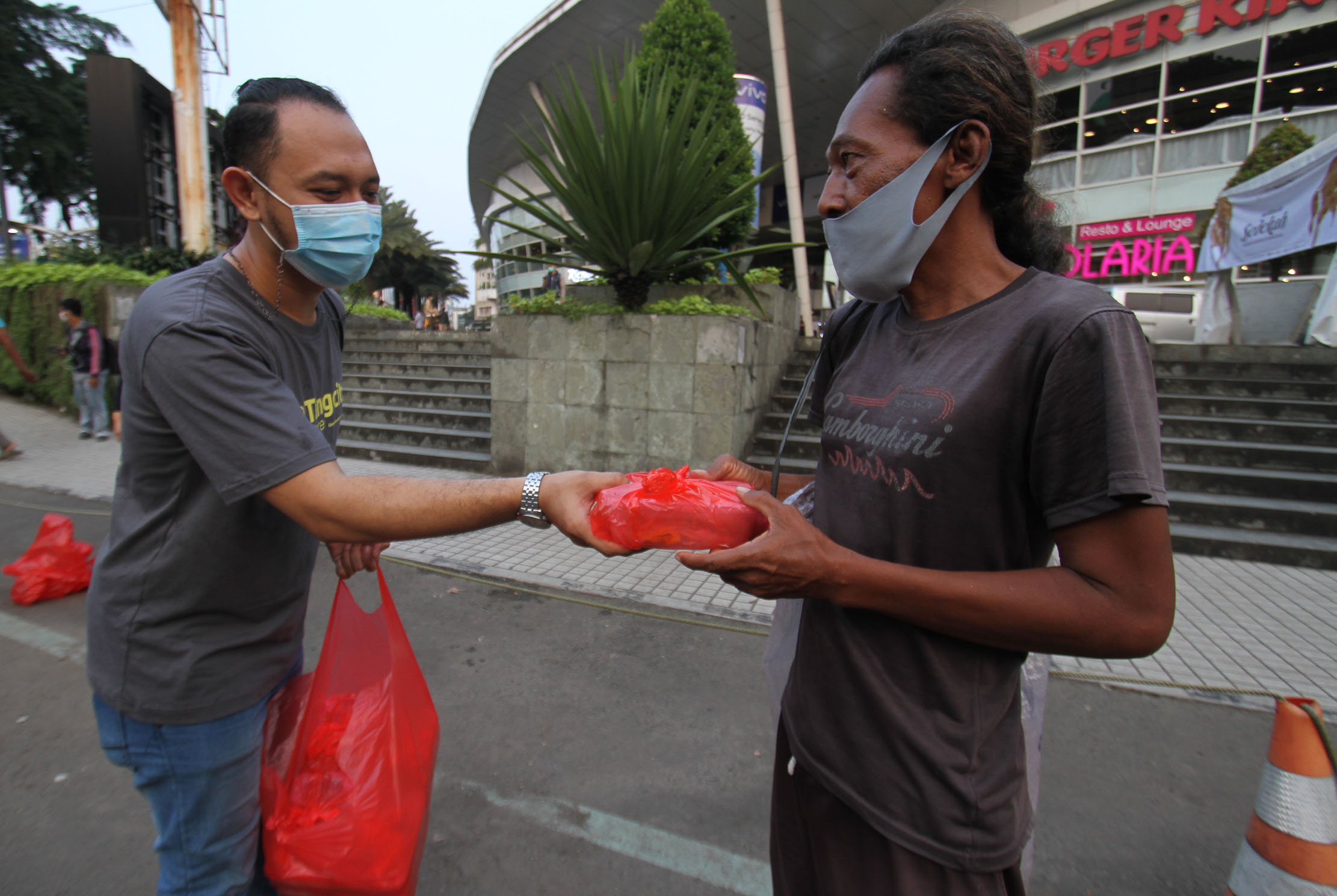 Suasana bagi-bagi takjil gratis untuk pejalan kaki dan pengendara yang tengah melintas di kawasan Jl Sudirman Tangerang , Jumat 17 April 2021. Foto : Panji Asmoro/TrenAsia