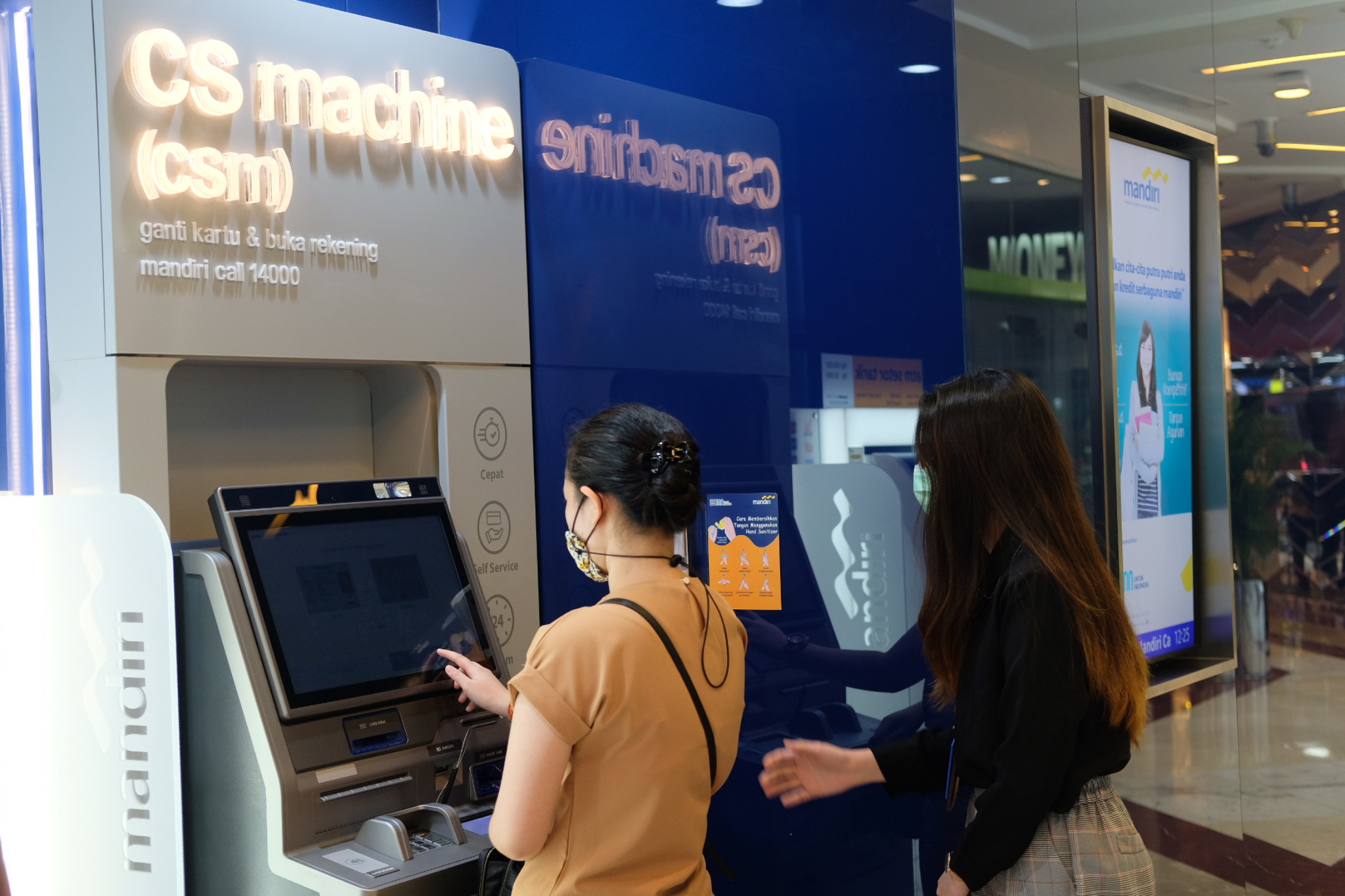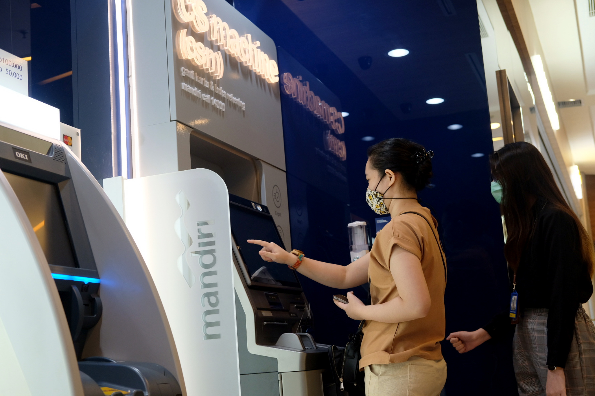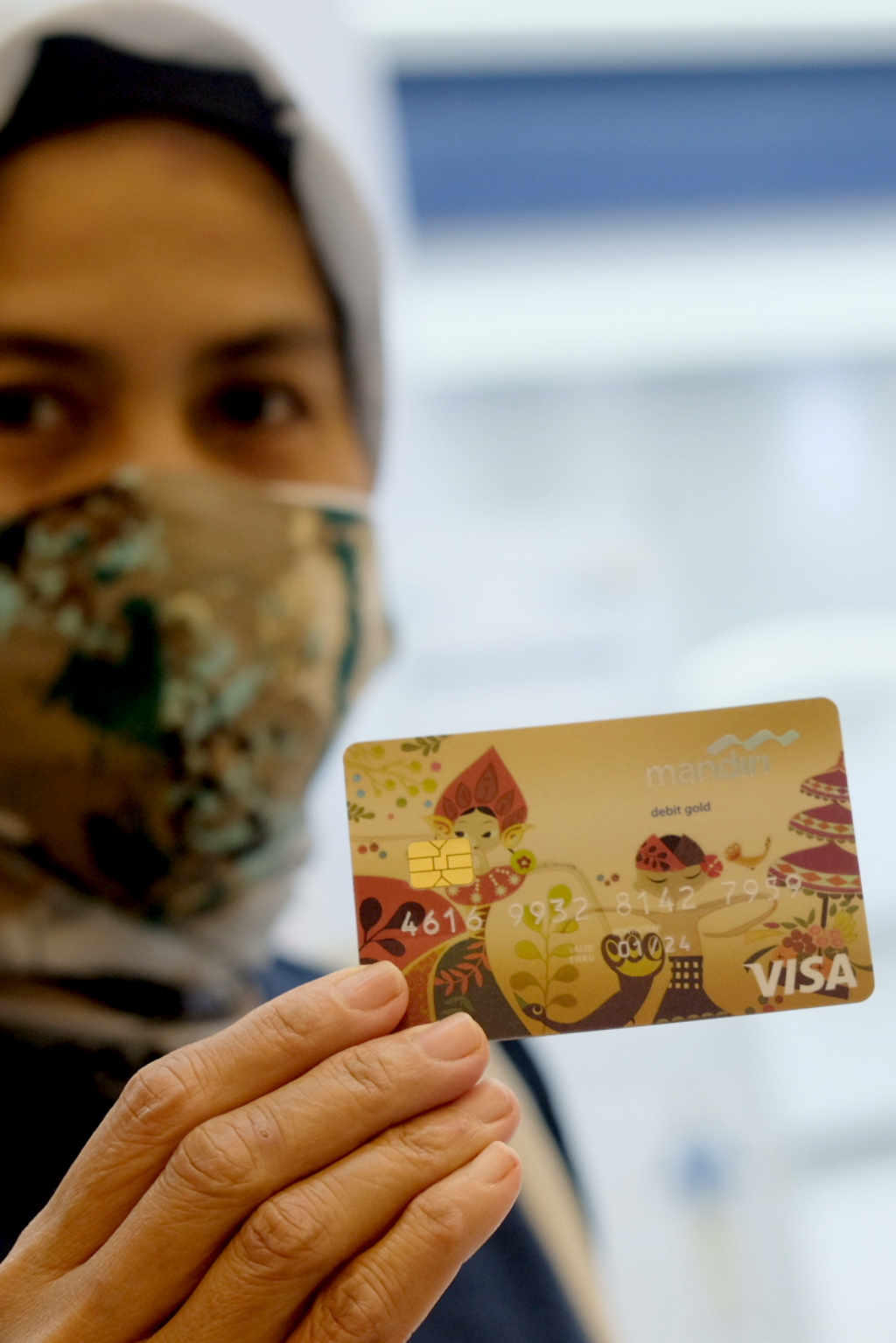 Karyawati menunjukkan kartu debit ATM dengan chip di kantor cabang Bank Mandiri Edu-Branch, Pondok Indah Mall 1, Jakarta, Kamis, 18 Februari 2021. Foto: Ismail Pohan/TrenAsia