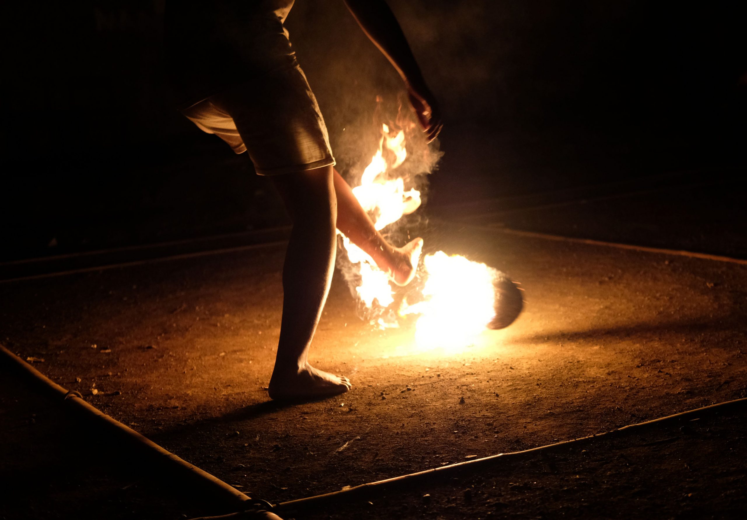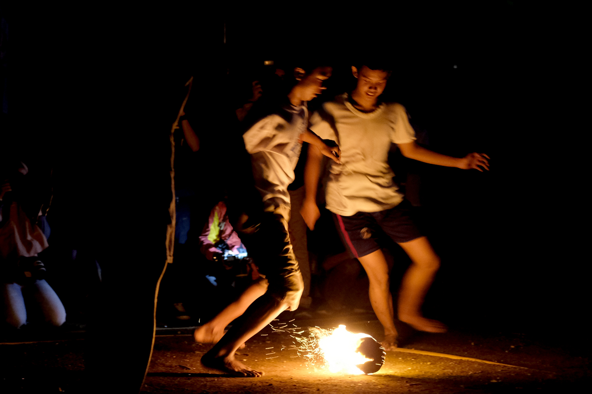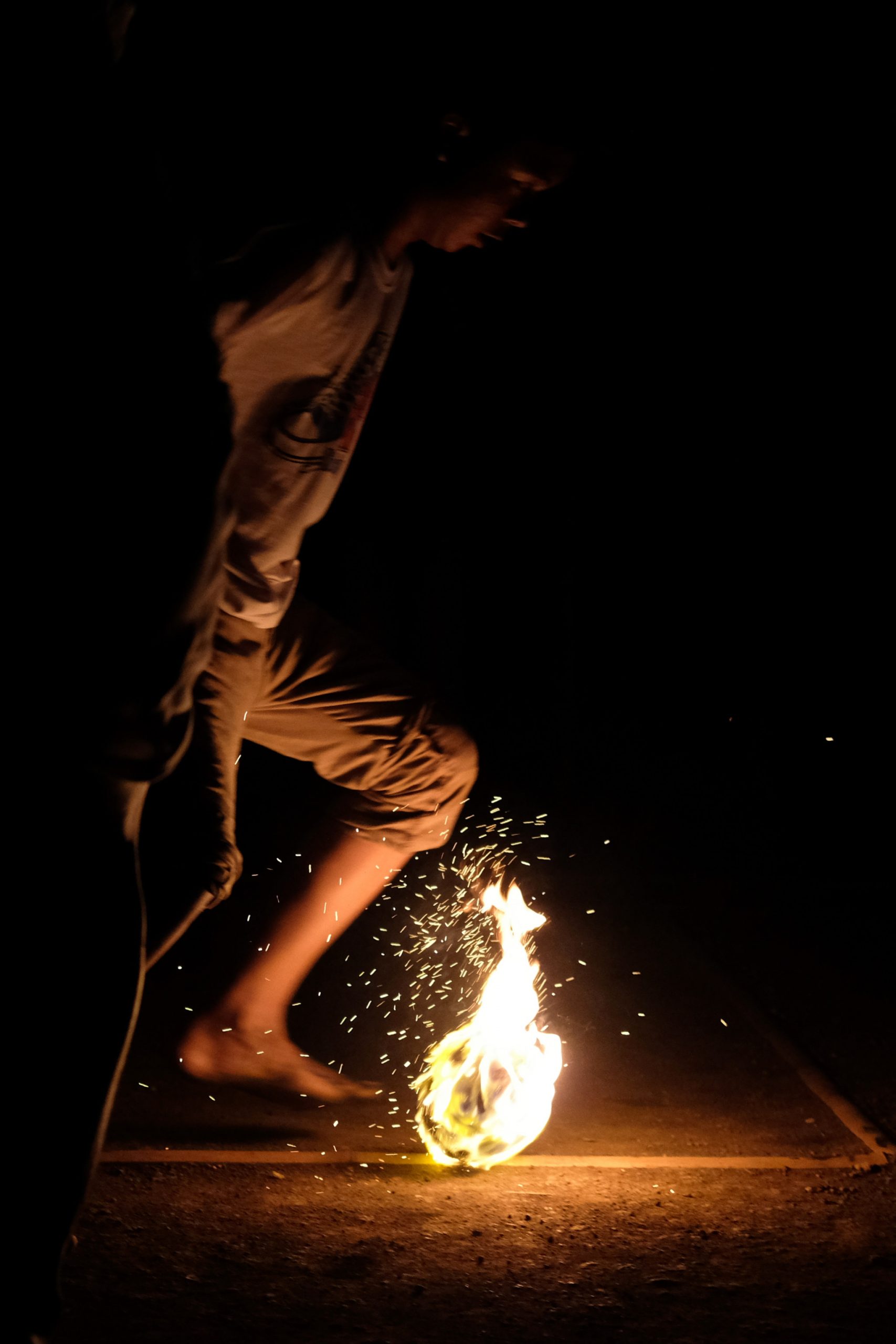 Warga menunjukkan atraksi sembur api saat peringatan malam 1 Muharram 1442 H di kawasan Rempoa, Ciputat, Tangerang Selatan, Banten, Rabu, 19 Agustus 2020 malam. Kegiatan Gema Muharram tersebut diisi dengan berbagai kegiatan lomba, pawai obor dan permainan tradisional sepakbola api yang rutin diadakan warga untuk menjaga kerukunan dan menyambut pergantian Tahun Baru Islam. Foto: Ismail Pohan/TrenAsia