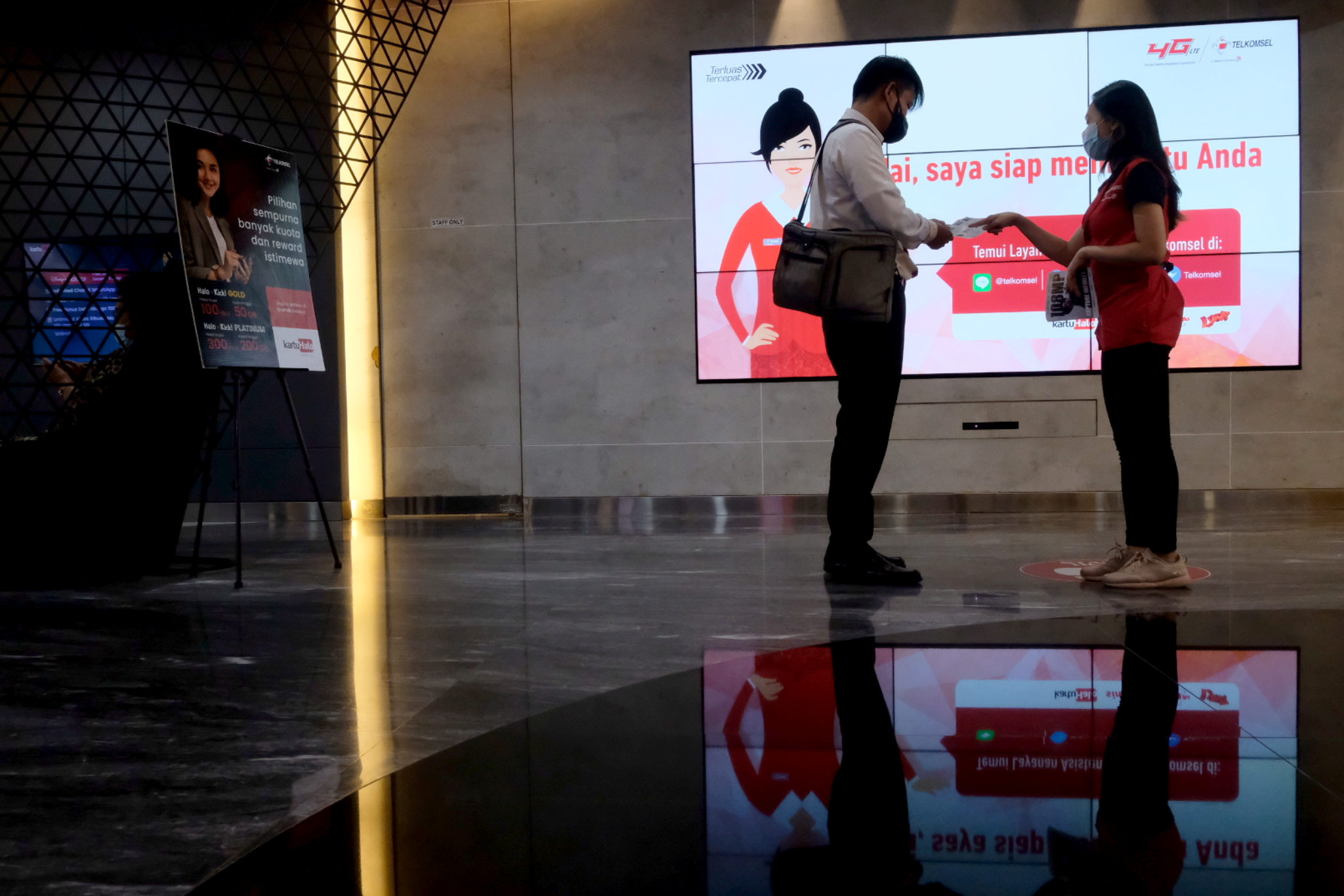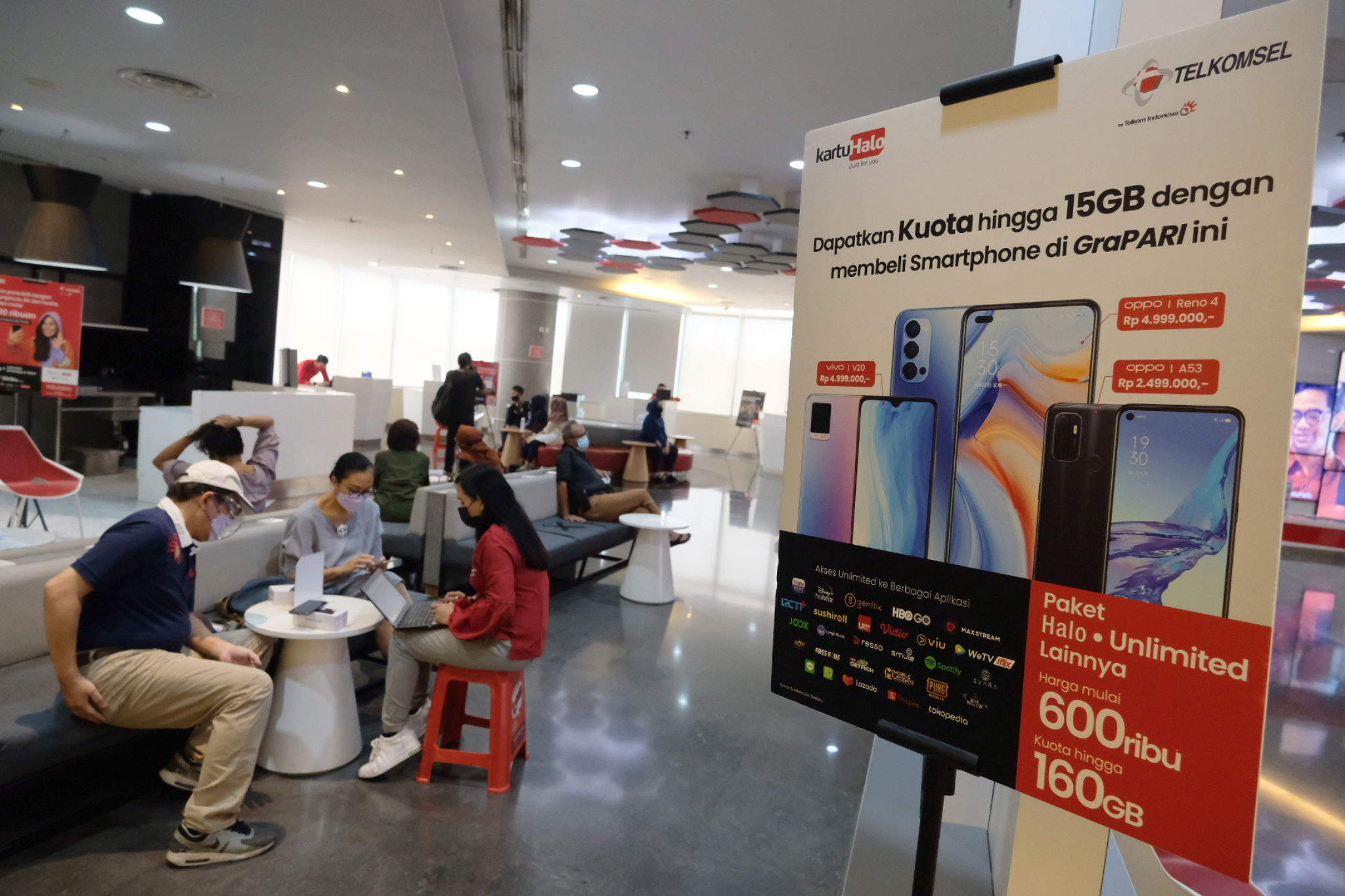 Karyawan melayani pelanggan di gerai GraPARI Telkomsel yang berada di salah satu pusat perbelanjaan di Jakarta, Senin, 19 April 2021. Foto: Ismail Pohan/TrenAsia