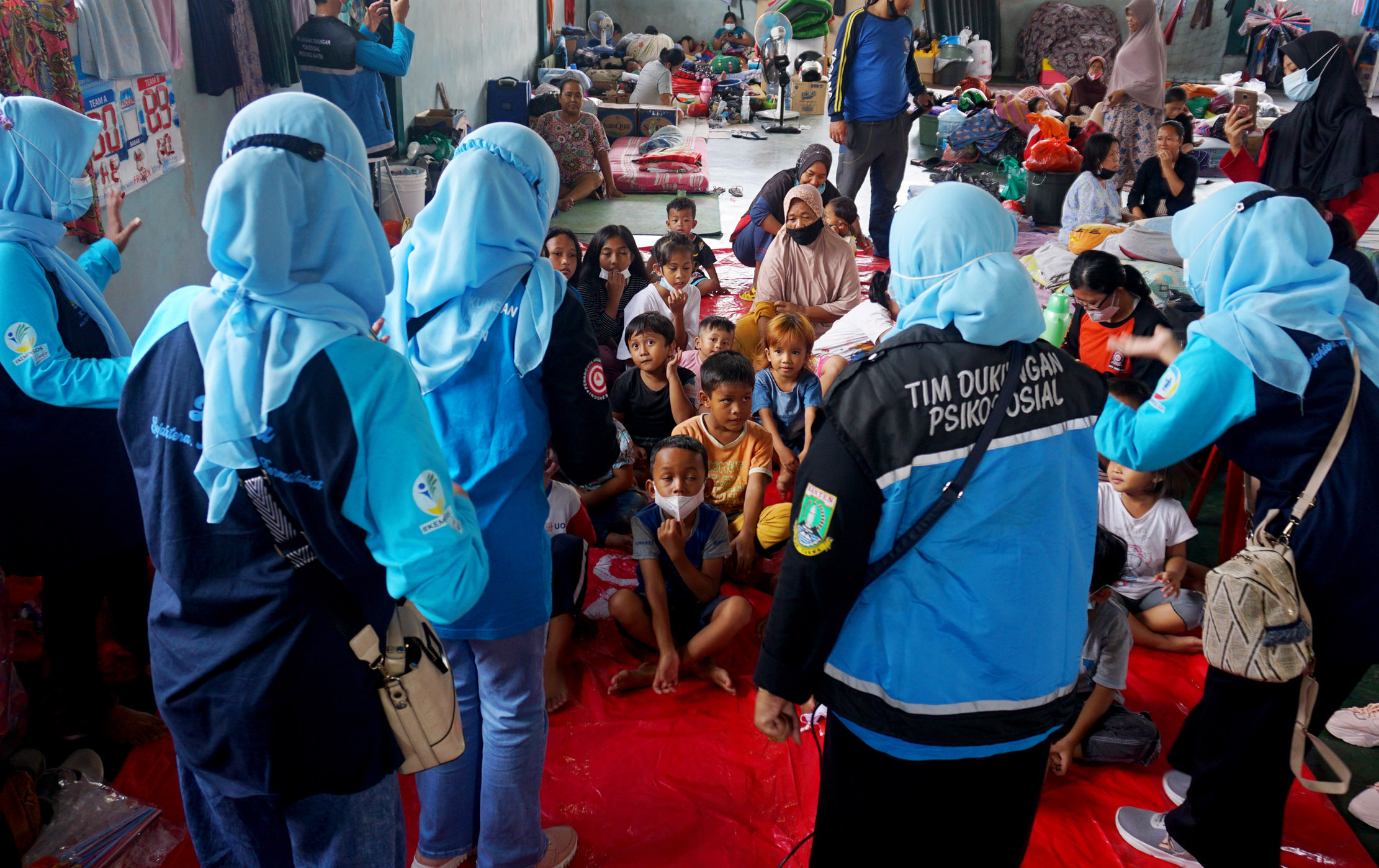 Tim Layanan Dukungan Psikososial dan Persatuan Seniman Komedi Korwil Tangerang tengah memberi Trauma Healing kepada anak-anak di pengungsian Gedung Olahraga Perumahan Total Persada,Kecamatan Periuk Kota Tangerang Rabu 24/2/2021. Foto : Panji Asmoro/TrenAsia
