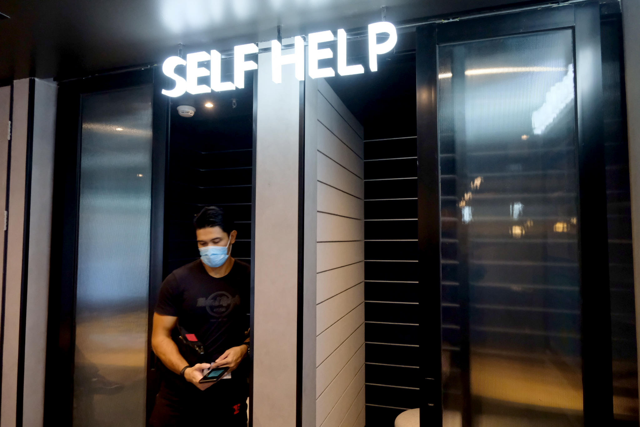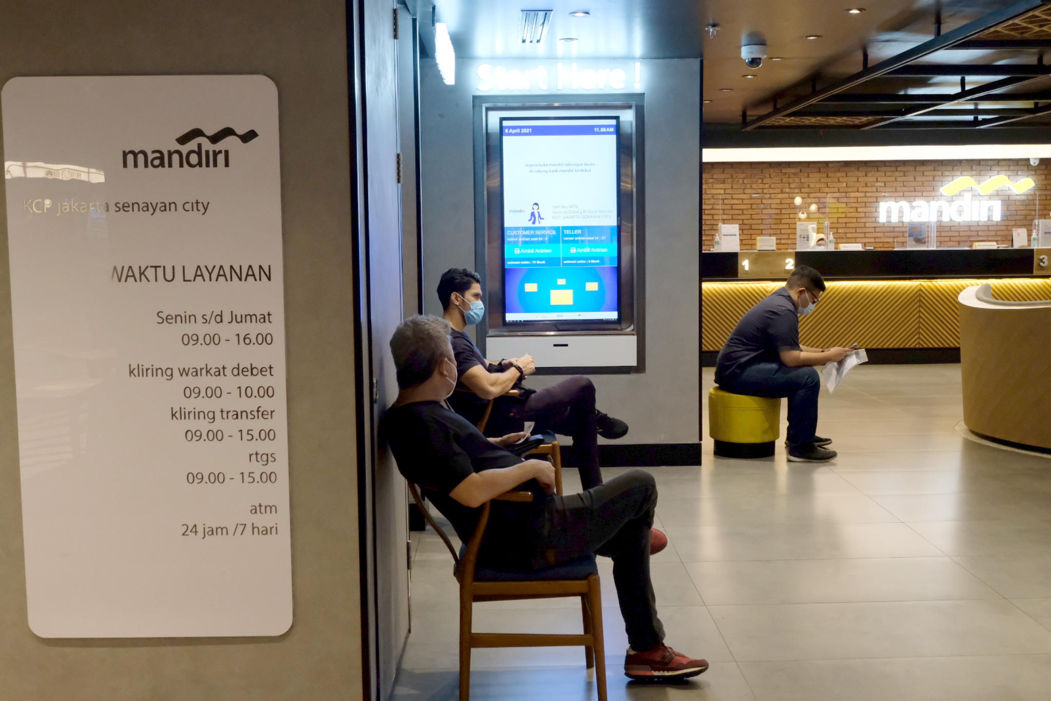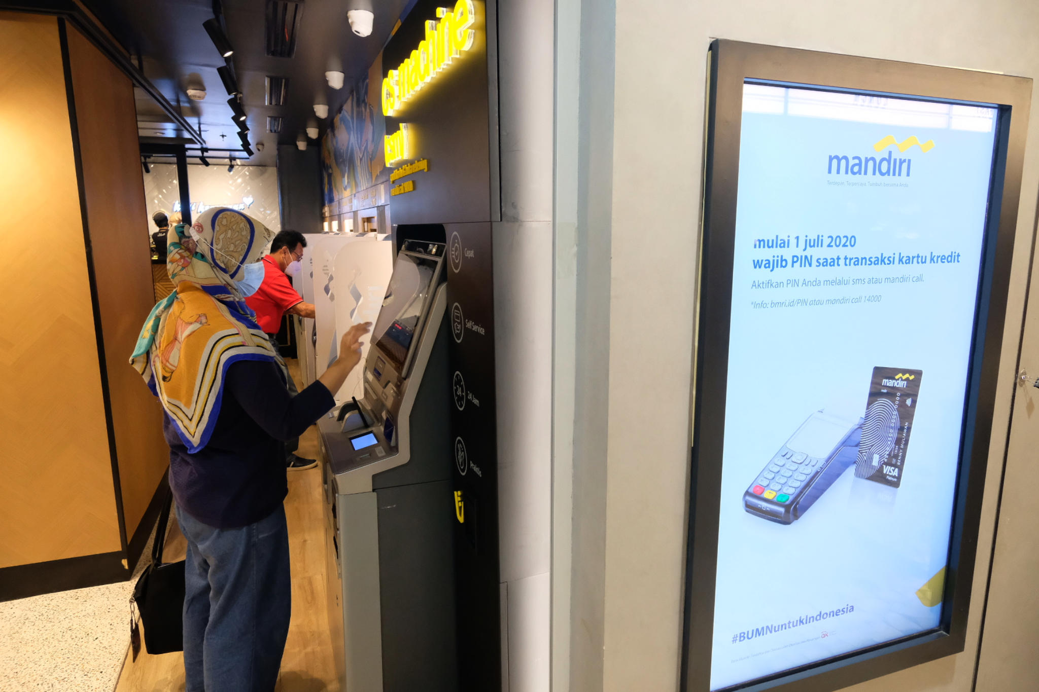 Nasabah mengunakan mesin customer service di gerai Bank Mandiri KCP Senayan City, Jakarta, Selasa, 6 April 2021. Foto: Ismail Pohan/TrenAsia