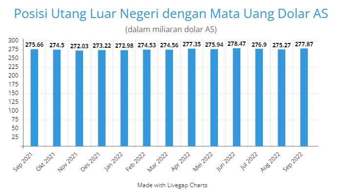 Menurut data statistik yang dirilis Bank Indonesia (BI), utang luar negeri dengan mata uang dolar AS pada kuartal III-2022 tercatat di angka US$277,87 miliar atau setara dengan Rp4,32 kuadriliun dalam asumsi kurs Rp15.564 perdolar AS.