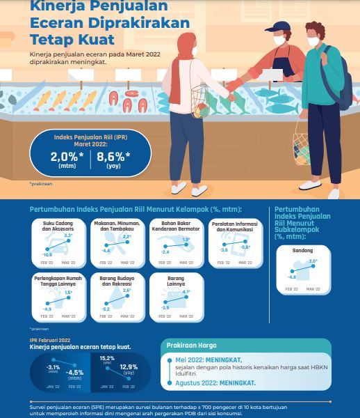 Untuk bulan Maret 2022 sendiri, kinerja penjualan eceran diperkirakan meningkat secara tahunan maupun bulanan. Secara tahunan, penjualan eceran Maret 2022 diprakirakan tetap tumbuh, yaitu sebesar 8,6% (yoy), atau lebih rendah dari 12,9% (yoy) pada Februari 2022. Kelompok yang tercatat tetap tumbuh tinggi antara lain Bahan Bakar Kendaraan Bermotor serta Makanan, Minuman dan Tembakau.
