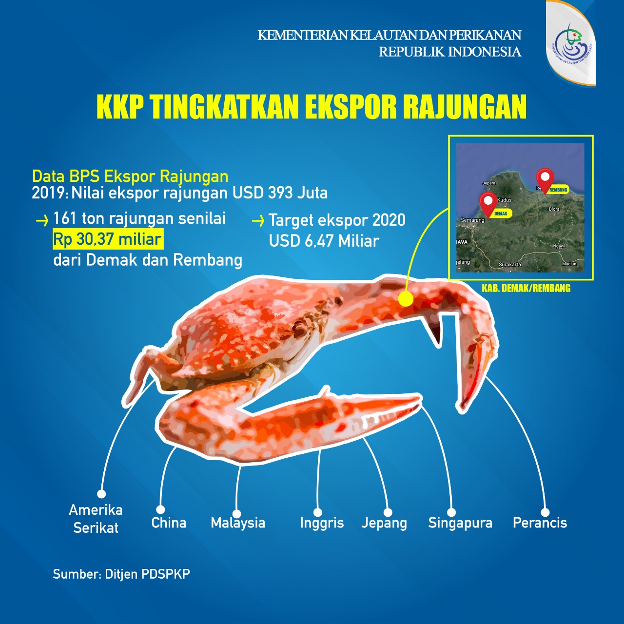 Bukan Hanya peningkatan ekspor dan perluasan pangsa pasar, KKP juga akan meningkatkan produktifitas dan mutu. Berdasarkan data Badan Pusat Statistik (BPS), nilai ekspor rajungan 2019 mencapai USD 393 Juta. Tahun ini, KKP menargetkan ekspor rajungan sebesar USD 6.47 miliar.