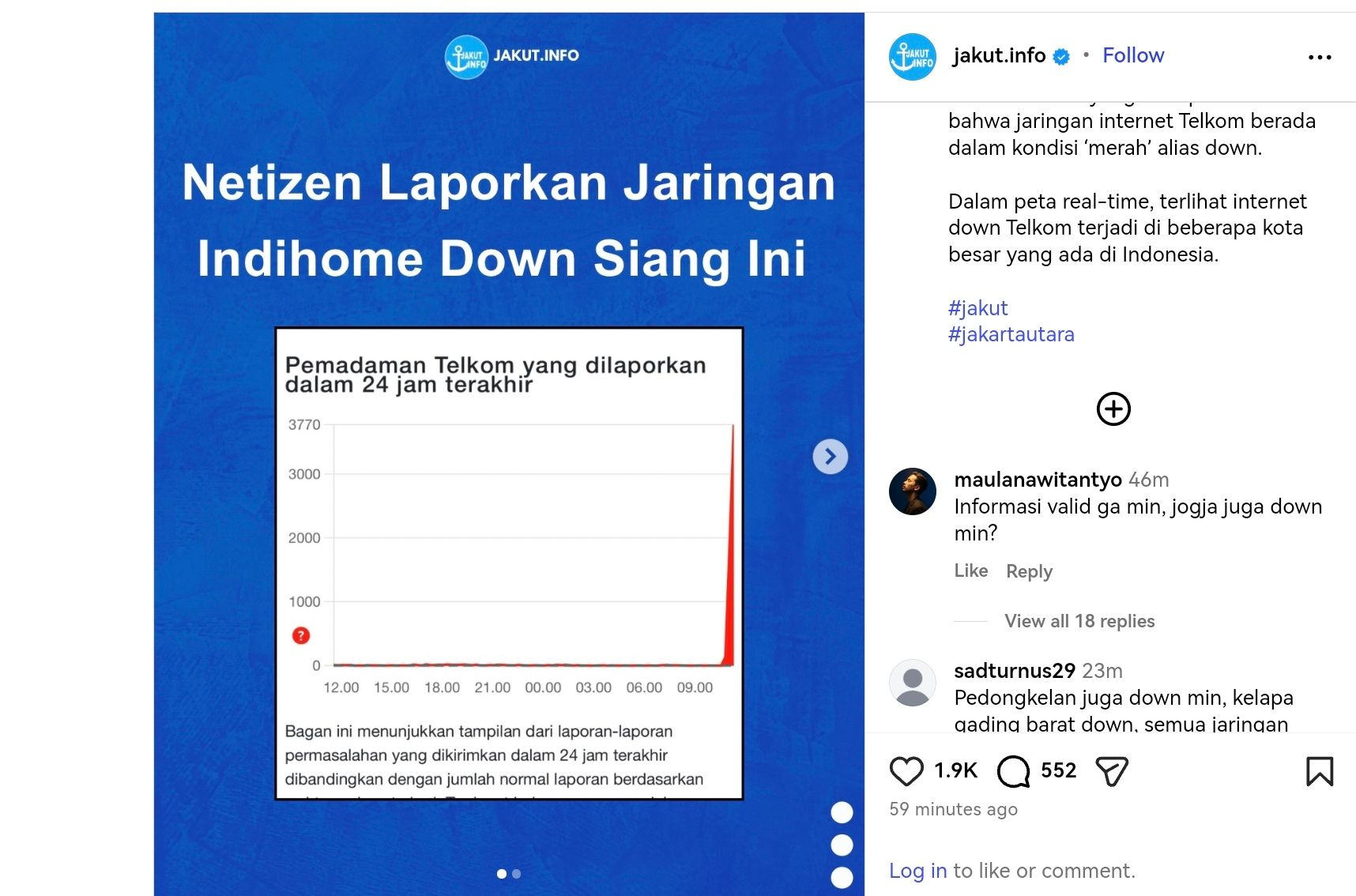 “Sama nih di Jaktim down. Pasti alasannya hujan tuh del..Heeee,” ungkap akun Instagram (@arweeb). “Bandung juga,” ungkap akun (@prabasuryajaya). “Sulawesi jugaaa,” ungkap akun (@4lpenliebell).