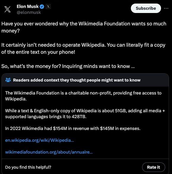 “Pernahkah Anda bertanya-tanya mengapa Wikimedia Foundation menginginkan begitu banyak uang? Tentu saja hal ini tidak diperlukan untuk mengoperasikan Wikipedia. Anda benar-benar dapat memasukkan salinan seluruh teks ke ponsel Anda! Jadi, untuk apa uang itu?,” tulis Elon Musk dalam postingan di situs X.
