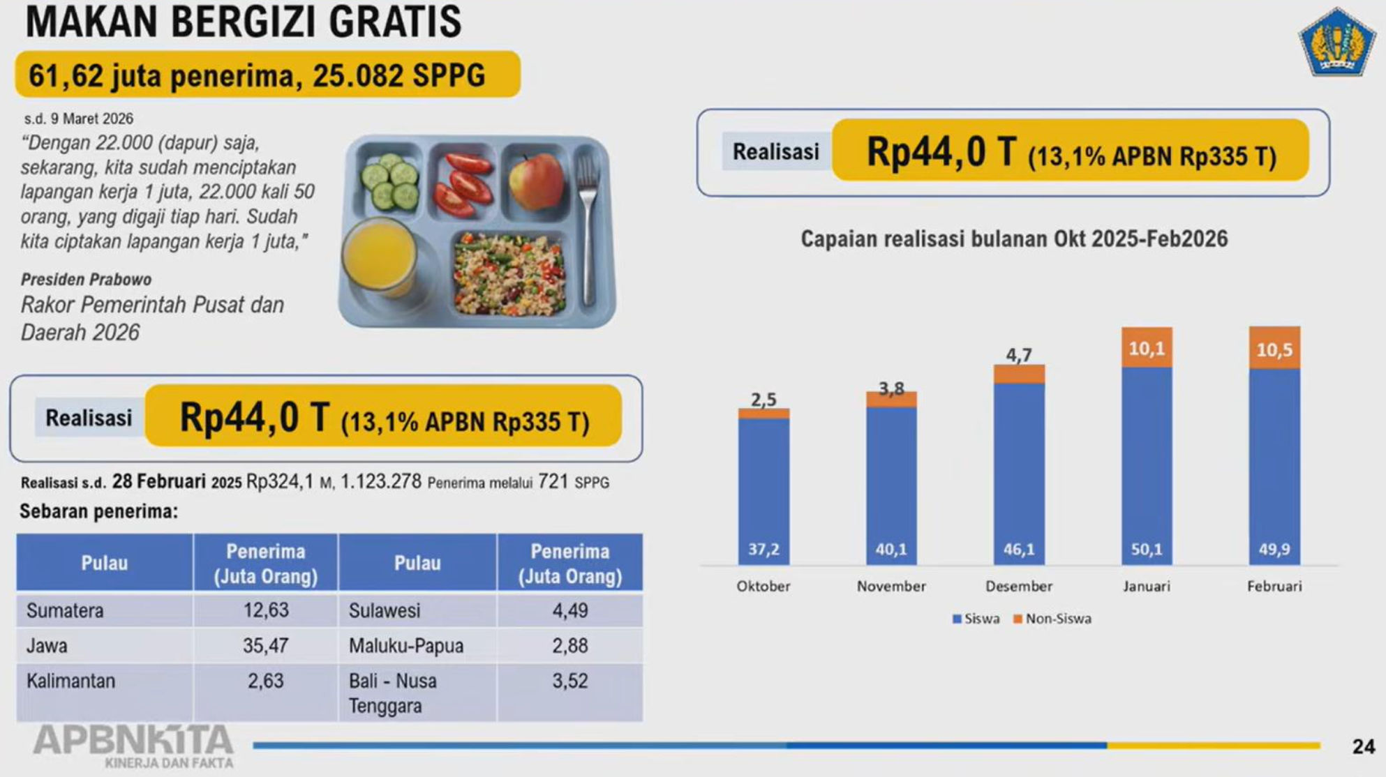 - Anggaran MBG melambung ke Rp44 T per awal Maret 2026. Program ini telah serap 61,62 juta penerima dengan biaya rata-rata Rp19,5 triliun sebulan. Bagaimana pengawasannya?