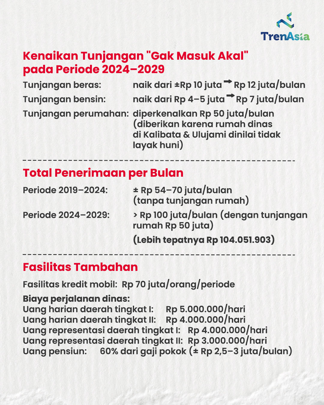 Diketahui, tunjangan bensin yang awalnya sekitar Rp4 juta hingga Rp5 juta naik menjadi Rp7 juta per bulan. Tunjangan beras juga naik dari Rp10 juta per bulan menjadi Rp12 juta. Tak hanya itu, anggota legislatif mendapatkan tunjangan rumah sebesar Rp50 juta per bulan. Jika ditotal, take home pay anggota DPR bisa mencapai Rp100 juta lebih.
