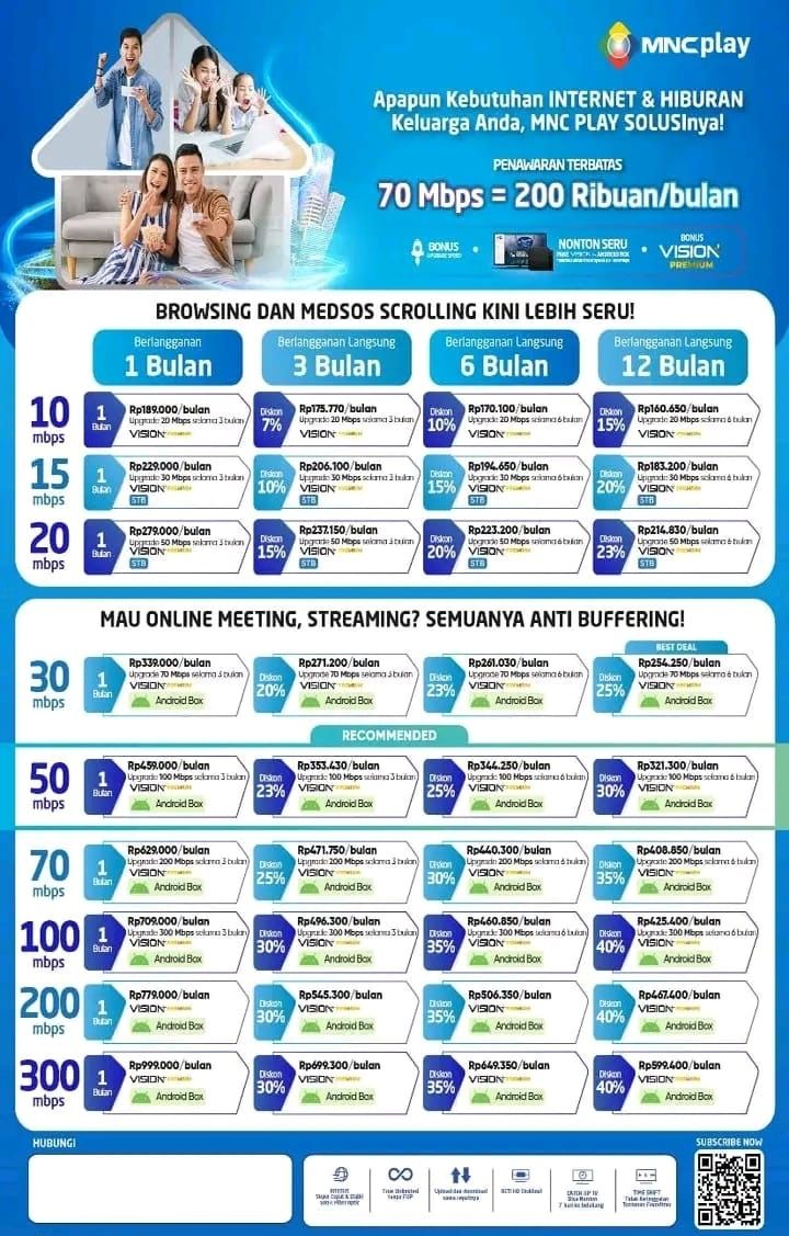 MNC Play menawarkan layanan internet fiber optik dengan kecepatan tinggi hingga ratusan Mbps, bahkan mencapai 10 Gbps di area tertentu. Selain internet, MNC Play juga menyediakan layanan IPTV dan konten hiburan digital. Provider ini banyak dipilih oleh pengguna yang membutuhkan koneksi cepat dan stabil untuk penggunaan banyak perangkat sekaligus.