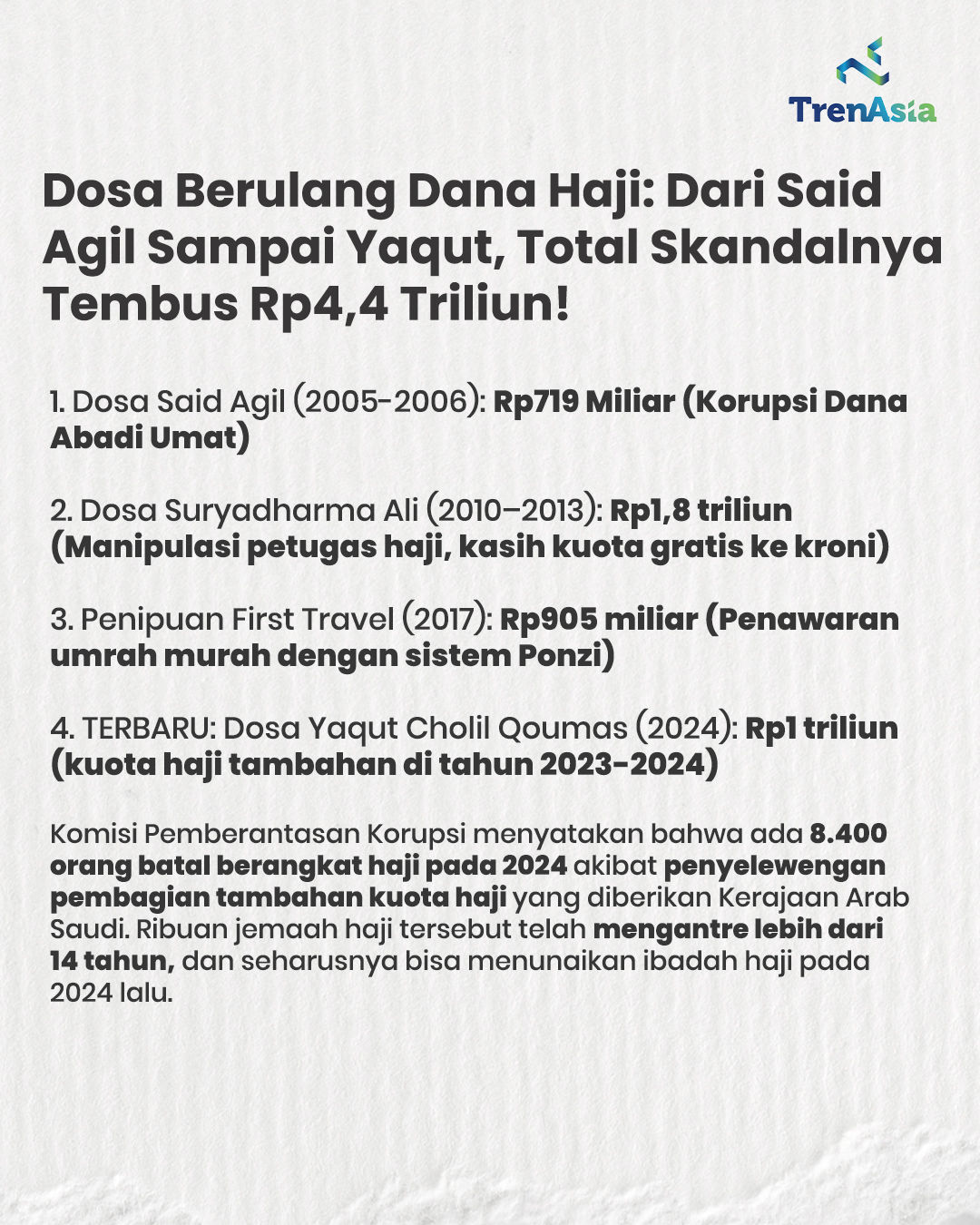 Namun, di balik optimisme ini, ada sejarah kelam yang menjadi latar belakangnya. Pembentukan kementerian ini tidak lepas dari noda hitam korupsi yang pernah menjerat penyelenggara haji di tanah air, dari level menteri hingga birokrasi bawahannya.