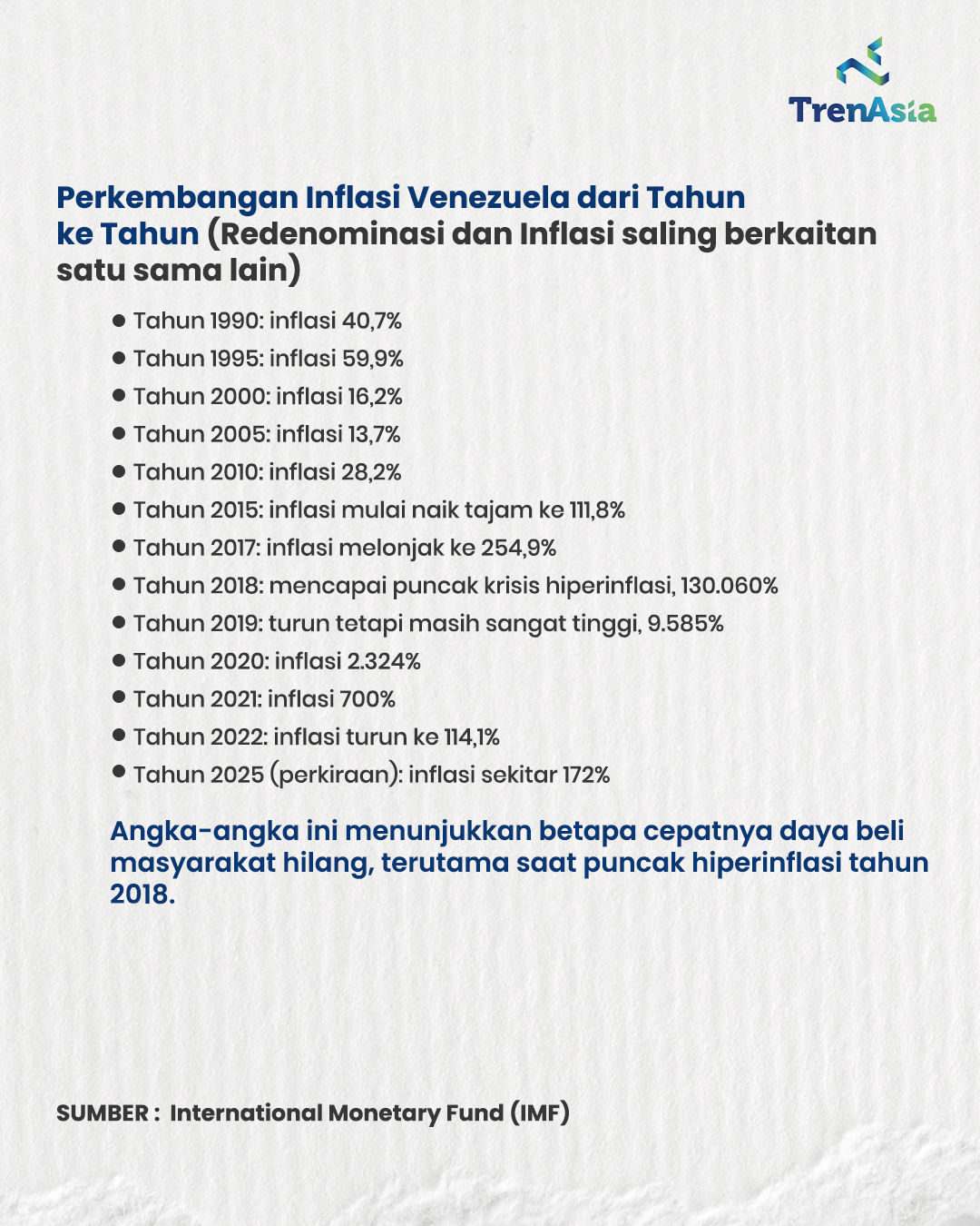 - Data IMF ungkap fakta mengejutkan soal Venezuela! Bayangkan, sejak 2008 mata uangnya sudah tiga kali dipangkas, hingga akhirnya 1 Bolívar Digital setara dengan 100 triliun Bolívar lama. Berikut rincian data inflasi dan nilai mata uang Venezuela dari waktu ke waktu.