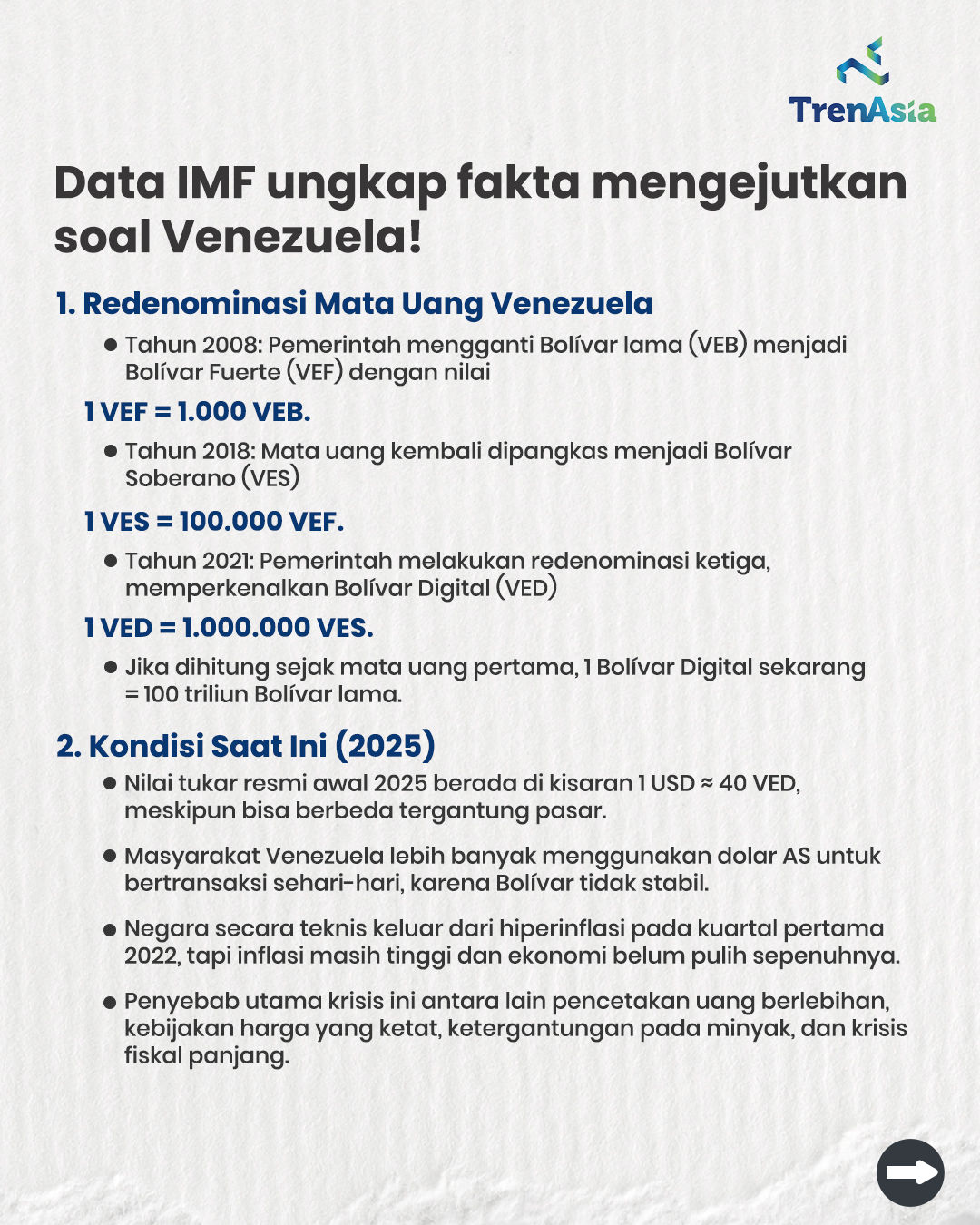 JAKARTA, TRENASIA.ID—Data IMF ungkap fakta mengejutkan soal Venezuela! Bayangkan, sejak 2008 mata uangnya sudah tiga kali dipangkas, hingga akhirnya 1 Bolívar Digital setara dengan 100 triliun Bolívar lama.