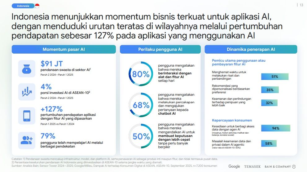 - Indonesia pimpin bisnis AI di ASEAN. Pendapatan aplikasi berbasis AI melonjak 127% meski porsi investasi masih relatif kecil.
