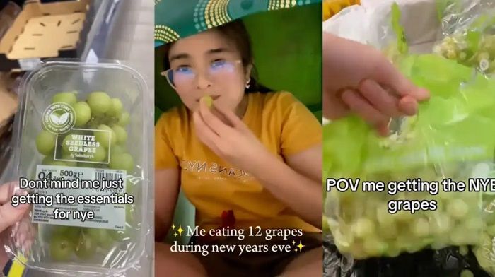 Pengguna TikTok memposting di media sosial dan mengatakan mereka makan 12 buah anggur merah atau hijau di bawah meja, dengan harapan orang lajang yang makan anggur di bawah meja pada Malam Tahun Baru akan mendapatkan jodoh.