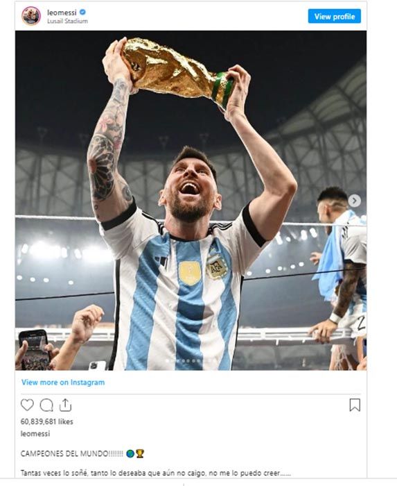 Pesepakbola  yang memimpin timnya meraih kemenangan Piala Dunia pertama mereka dalam 36 tahun  menerima lebih dari 60 juta like untuk koleksi fotonya (saat penulisan). Ini mencetak lebih dari tiga juta like lebih banyak daripada posting pemecah rekor sebelumnya yang tanpa diduga dipegang oleh gambar telur yang sederhana.
