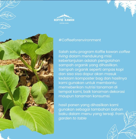 Hasil dari kompos tersebut digunakan untuk menyuburkan tanaman rempah dan sayuran yang tumbuh di halaman Koffie Kawan. Menariknya, tanaman-tanaman tersebut kemudian dimanfaatkan sebagai bahan baku untuk berbagai menu makanan dan minuman di kedai.
