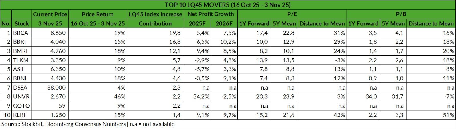 Berdasarkan data pergerakan pasar sejak penutupan perdagangan 16 Oktober hingga 3 November 2025, indeks LQ45 tercatat menguat sekitar 8%, melampaui kenaikan Indeks Harga Saham Gabungan (IHSG) yang hanya berkisar 2% dalam periode yang sama. Sejumlah saham konsumer dan perbankan tercatat menjadi kontributor terbesar terhadap kenaikan indeks tersebut.